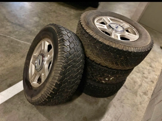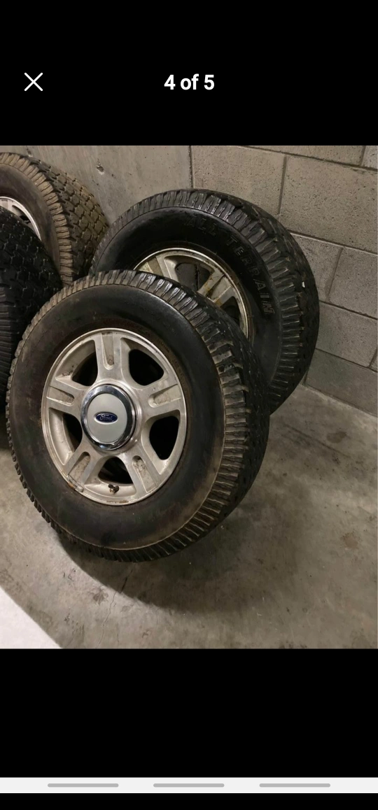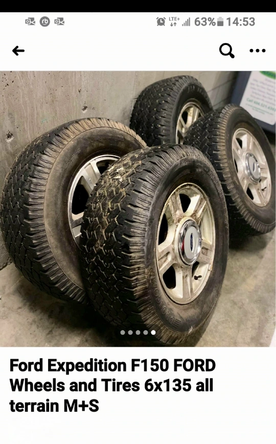 Set of 4 Ford wheels and tires. 6x135 bolt pattern, all-terrain M+S tires Aluminum Rims came off Ford Expedition and I was going to put on my F150 as a winter set but have decided not to. Tire shop took 3 tires off the rims. The rims are in great condition. If you need me to deliver we can discuss the amount for delivery fee call or text Mike 6043493464