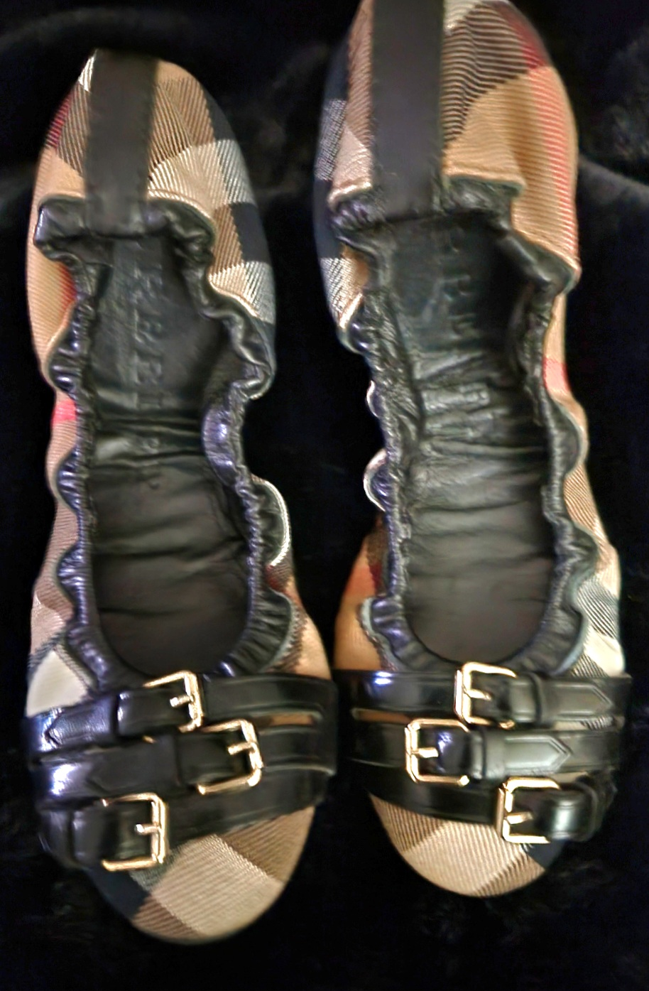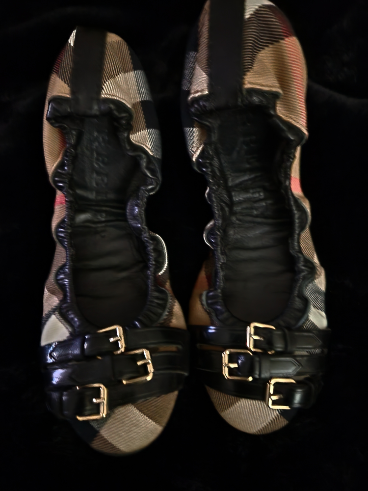 cute ballet type flats. with black patent bows and buckles. Very comfortable.