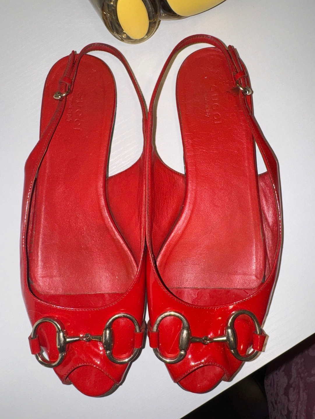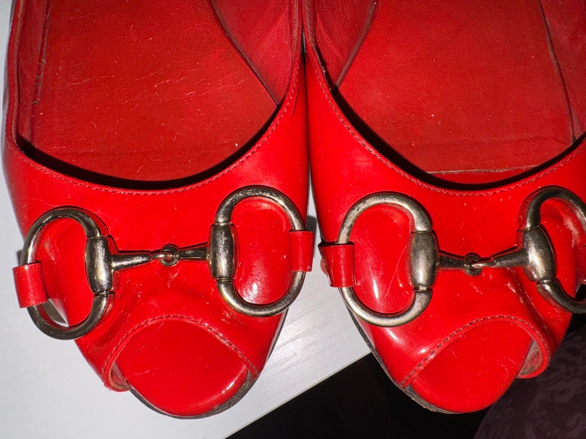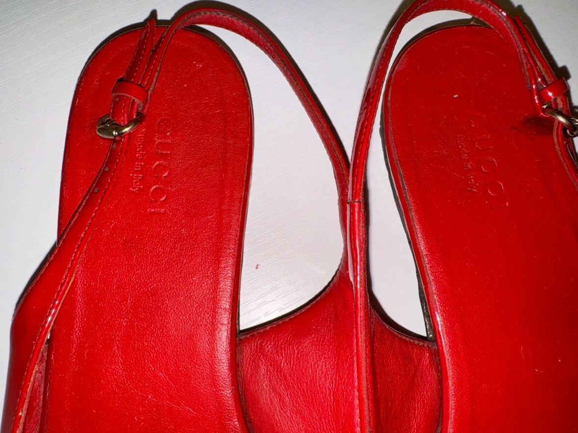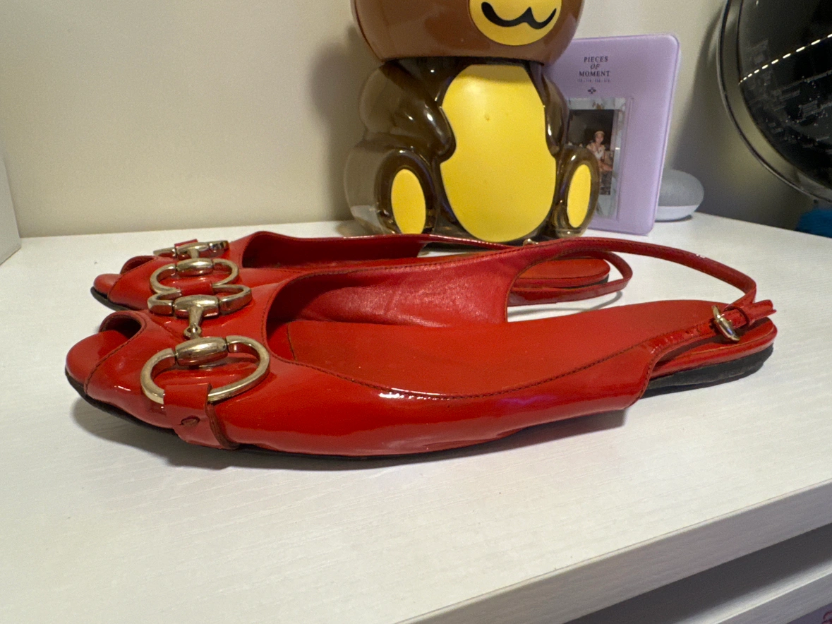 Red leather Gucci flats with signature double buckle at the front. The red leather is in very good condition and without scratches. The soles do have slight fading and an uneven surface. See all photos