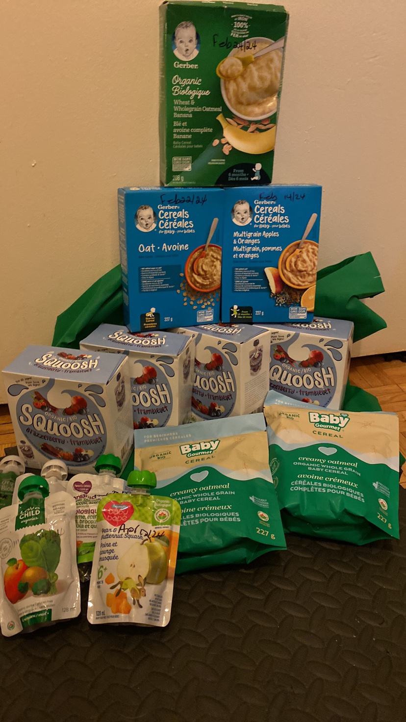All sealed. Got too many. Baby isn’t interested in them as much as before fruit squeeze one for all ages (4 boxes) some loose pouches for 6 months plus Baby cereal A variety *NOTE THE BABY CEREAL BEST BEFORE DATE JUST PASSED. SOME TIME IN FEB*