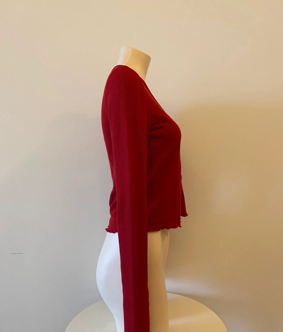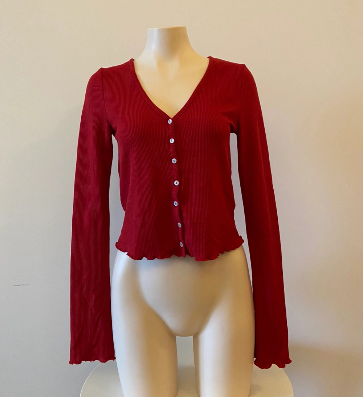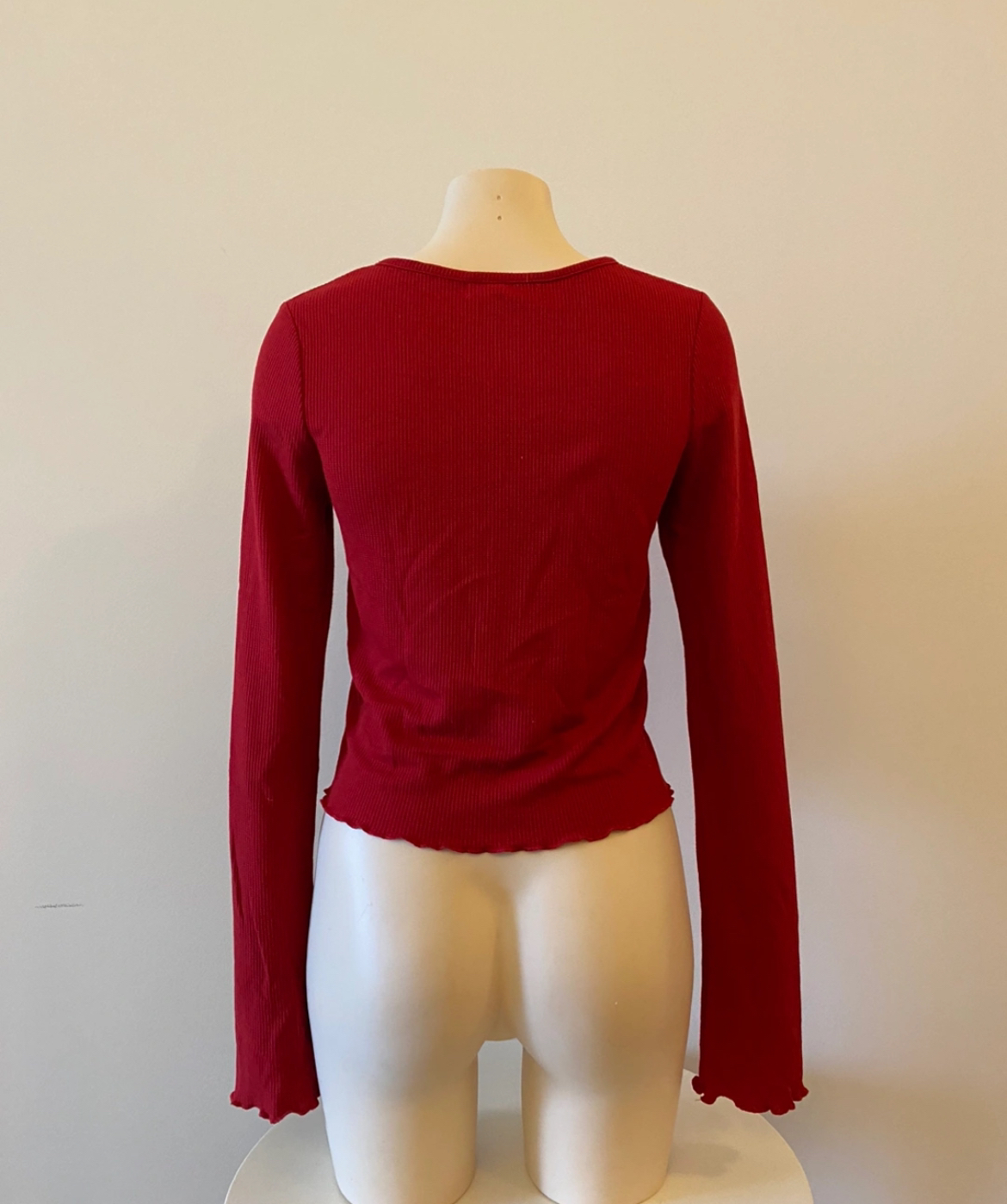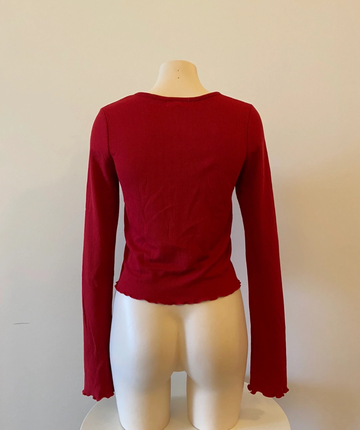 Size M on XS mannequin for reference. Fitted with long sleeves and frilly detail on hem Cash only. Msg to schedule pick up:)