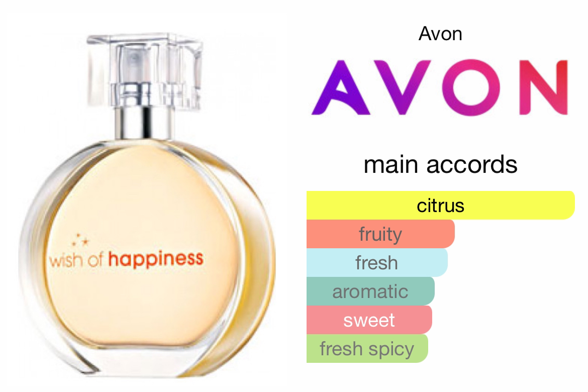 Wish of Happiness by Avon is a Citrus Aromatic fragrance for women. Wish of Happiness was launched in 2008. Top note is Pink Grapefruit; middle notes are Pear and Lemon; base note is Neroli.