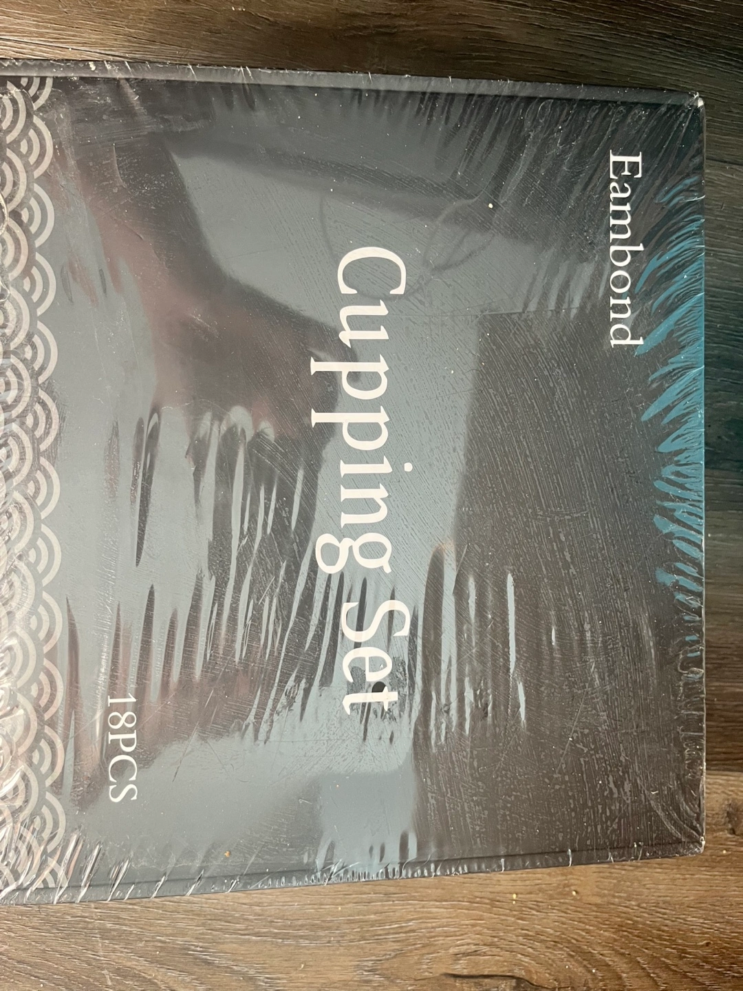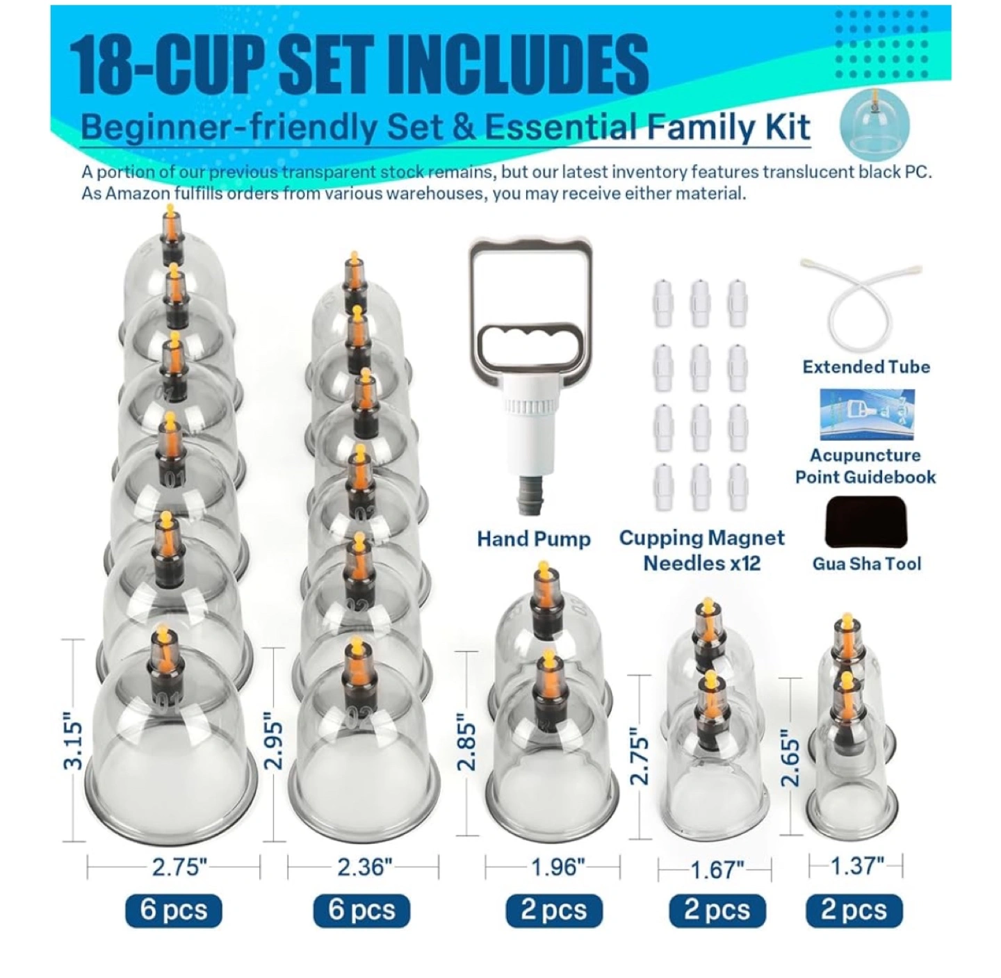 Beginner-friendly cupping set. Includes 18 cups in various sizes, hand pump, 12 acupuncture needles, gua sha tool, and extended tube. New, in box. May be translucent black or transparent.