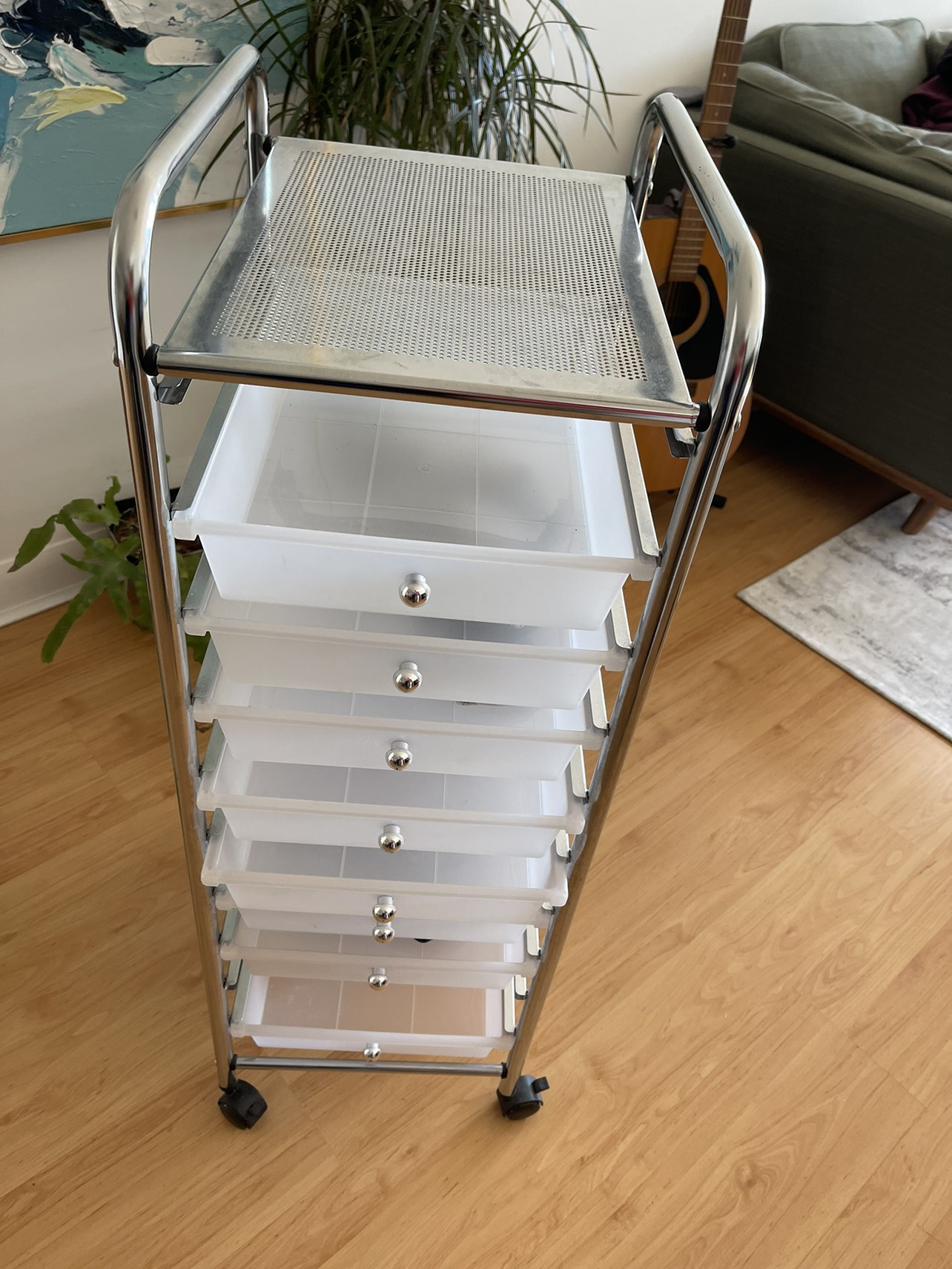 Plastic drawers great for organizing supplies eg. Art supplies. Two drawers are missing, but allows you to rearrange drawers to accommodate taller items