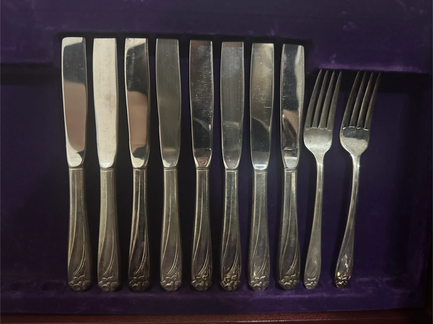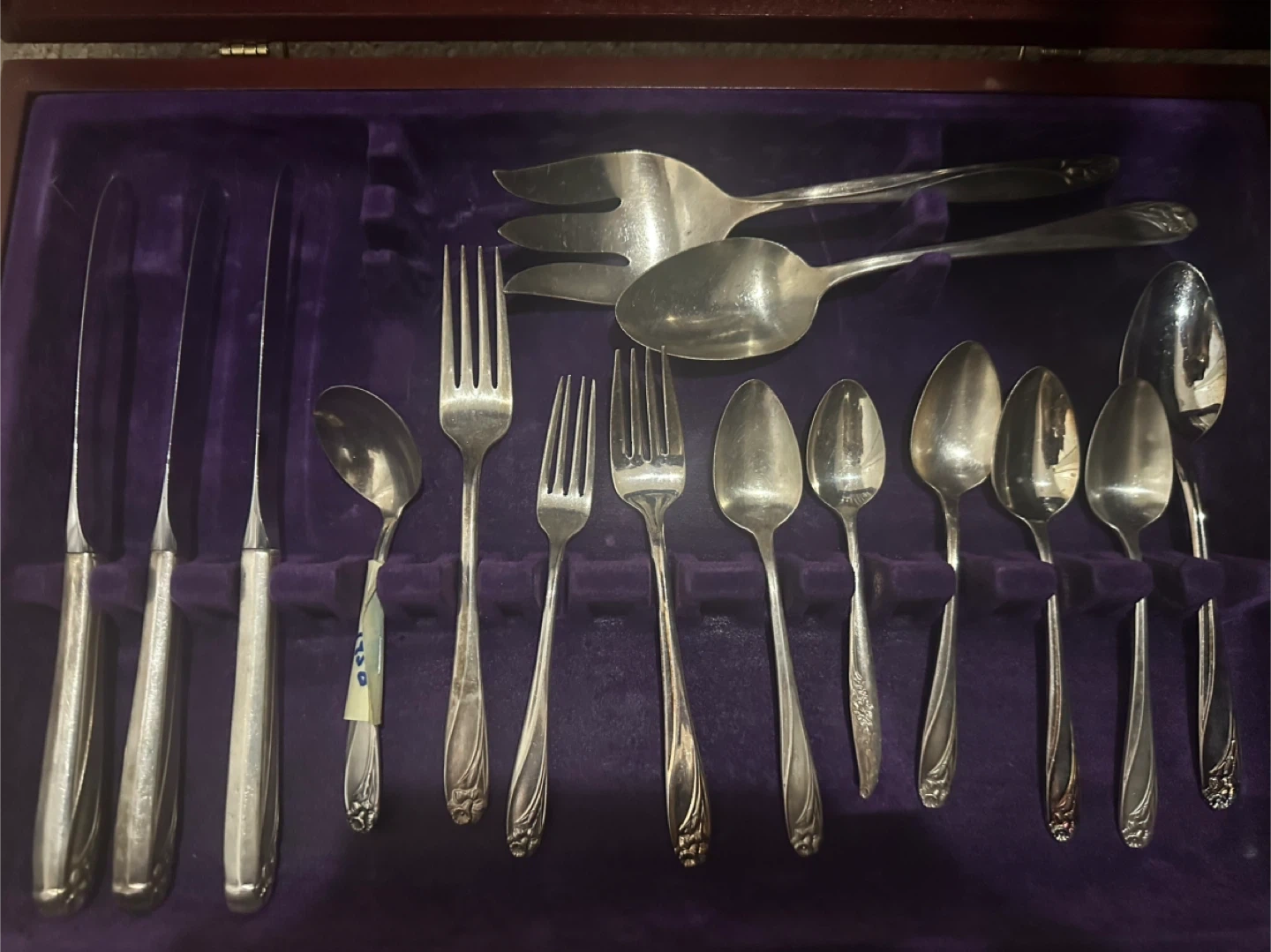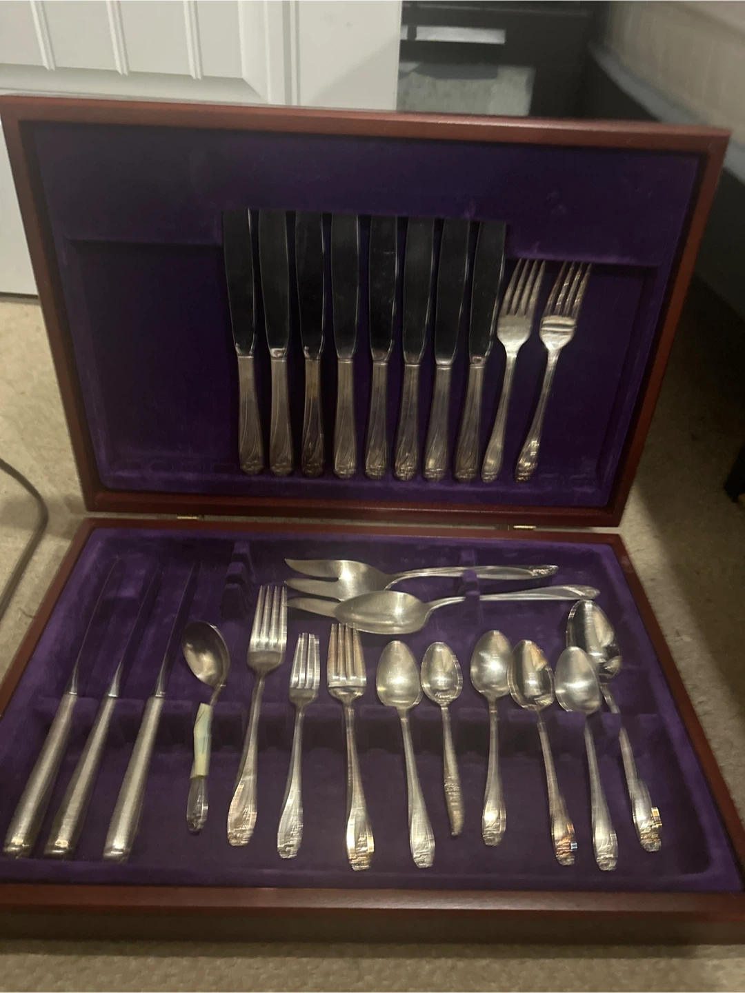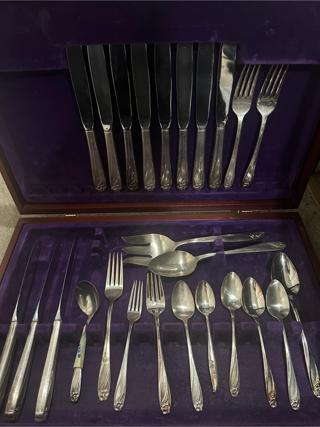 Description: Vintage 1847 Rogers Bros “Daffodil” silverplate flatware set in original wooden case. Beautiful floral pattern, highly collectible. Includes: • 11 dinner knives • 3 large forks • 2 smaller forks • 5 small spoons • 1 large spoon • 1 ladle-style spoon • 1 salad/serving fork • 1 salad/serving spoon Condition: Gently used, some natural wear from age, but overall in good vintage condition. Case included. 👉 Sold as entire set only. 📍 Pick up near Pattinson Station.