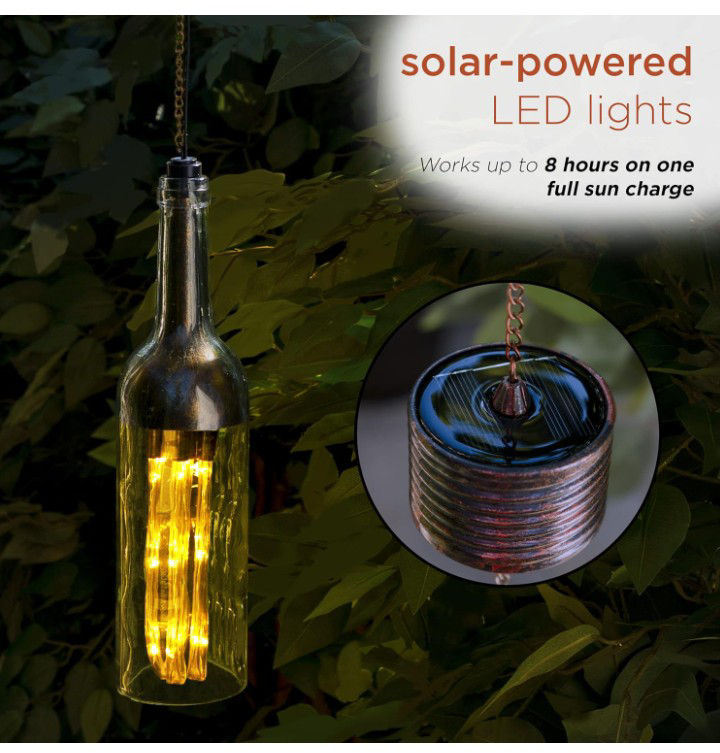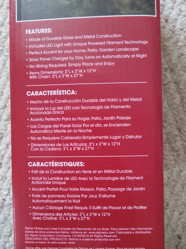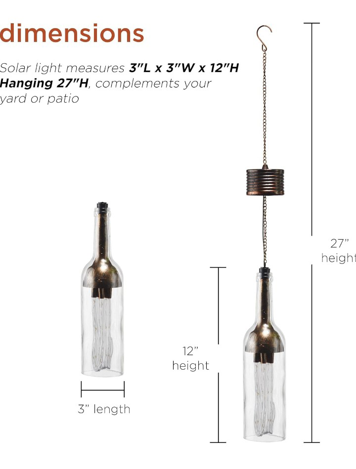 -Measures 3''W x 3''L x 27''H, made of Metal and Glass -Solar panel charges by Day, turns on Automatically at Night -No wiring required. Sinply placevand enjoy. -This solar decor offers a truly unique look that is sure to impress and please -Made of durable materials that will perfect your home, yard, and garden decor