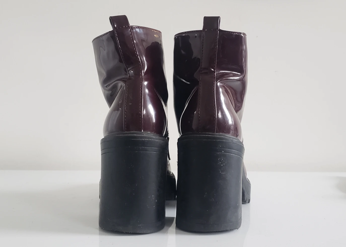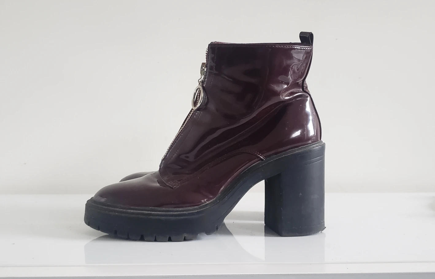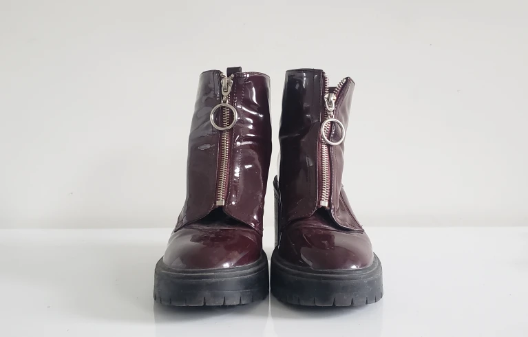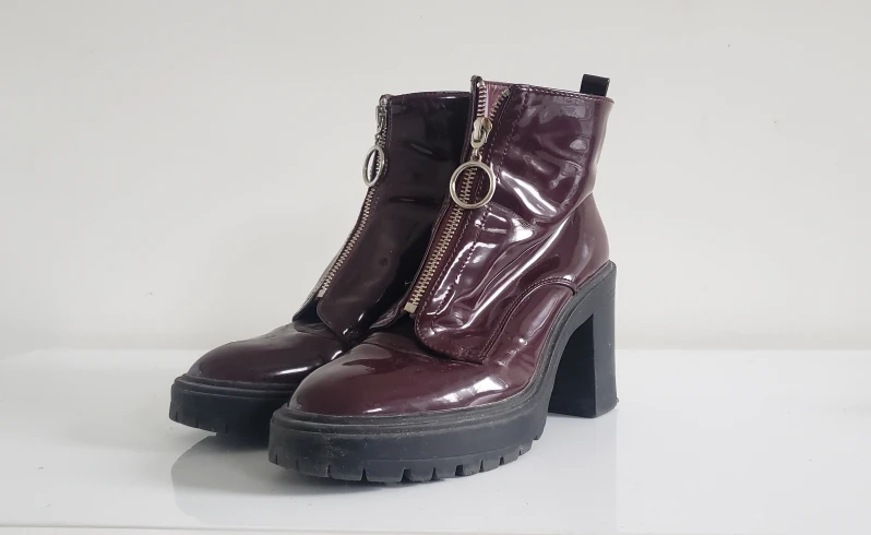 GUC - some scuffs and the left shoes zipper can be fussy at times. Burgundy plastic material -- waterproof. Chunky heel with lug sole and circle silver zip detail. Well balanced and extremely comfortable--so much so I bought two pairs (BLACK PAIR ALSO FOR SALE!) 😅 demonia, dollskill look to them. take both black & burgundy for $15 Closet cleanout right now and have way too many shoes. Check out my other listings!
