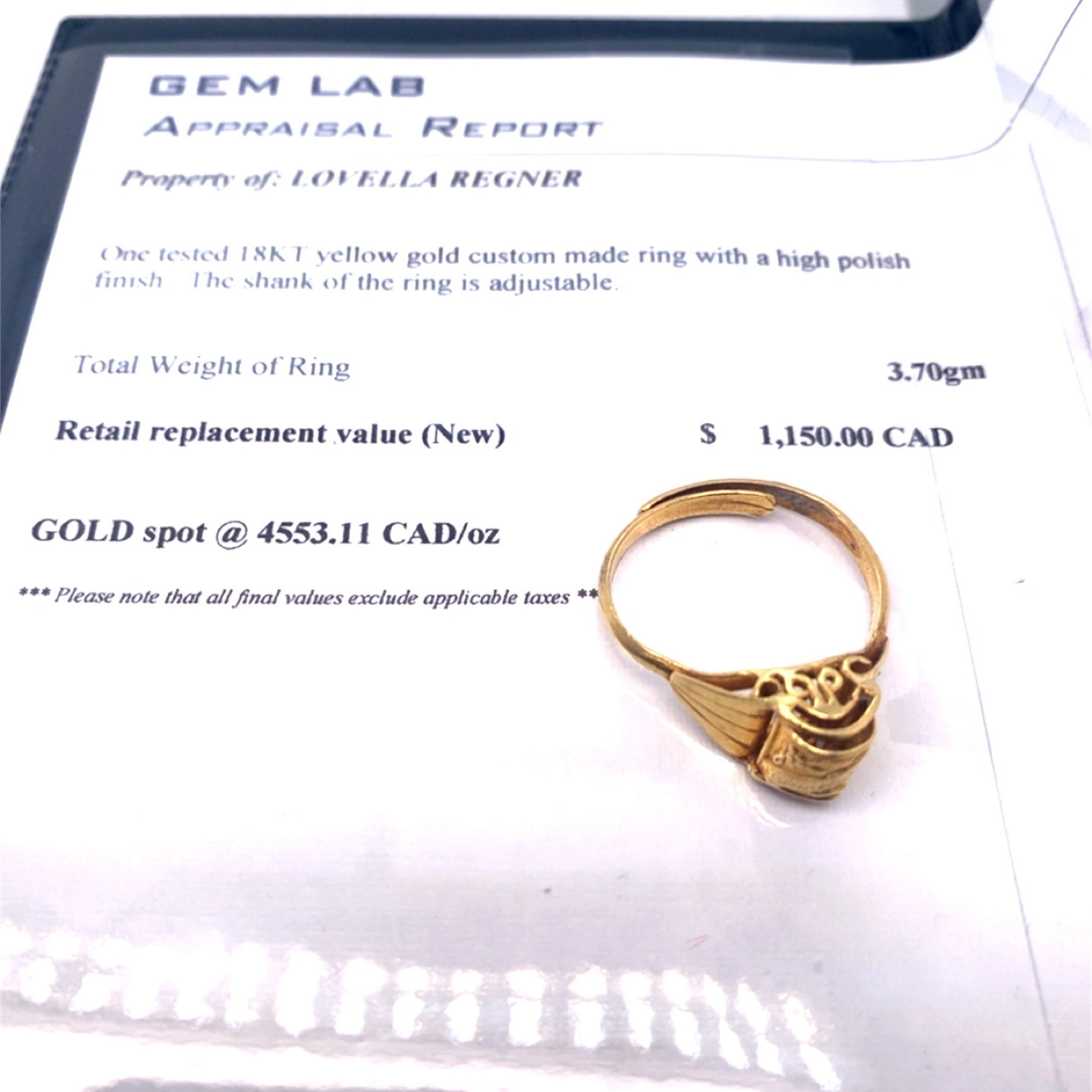 Selling a beautiful 18K yellow gold custom-made ring with a high polish finish. The shank of the ring is adjustable. The total weight of the ring is 3.70gm. Originally appraised for $1,150.00 CAD.