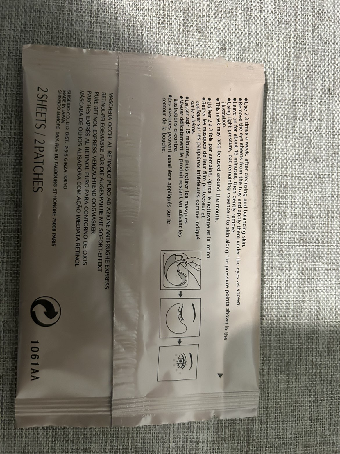 Shiseido Benefiance Wrinkleresist 24 pure retinol express smoothing eye mask. Have 3 packettes left. Each contains 2 sheets. Original price- $8 dollars. Buy 3-$15 Pick up near Eaton centre. Cheers!