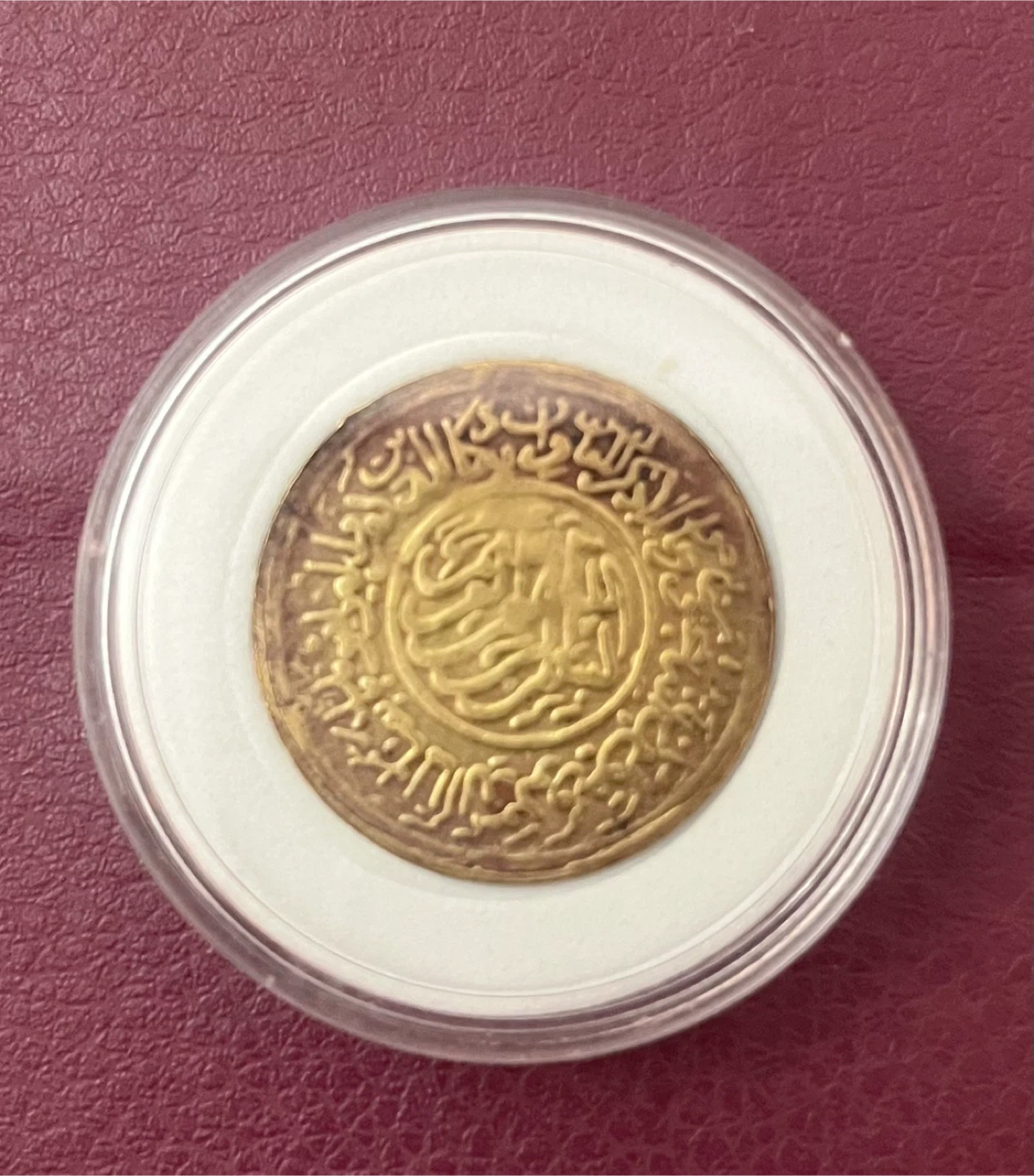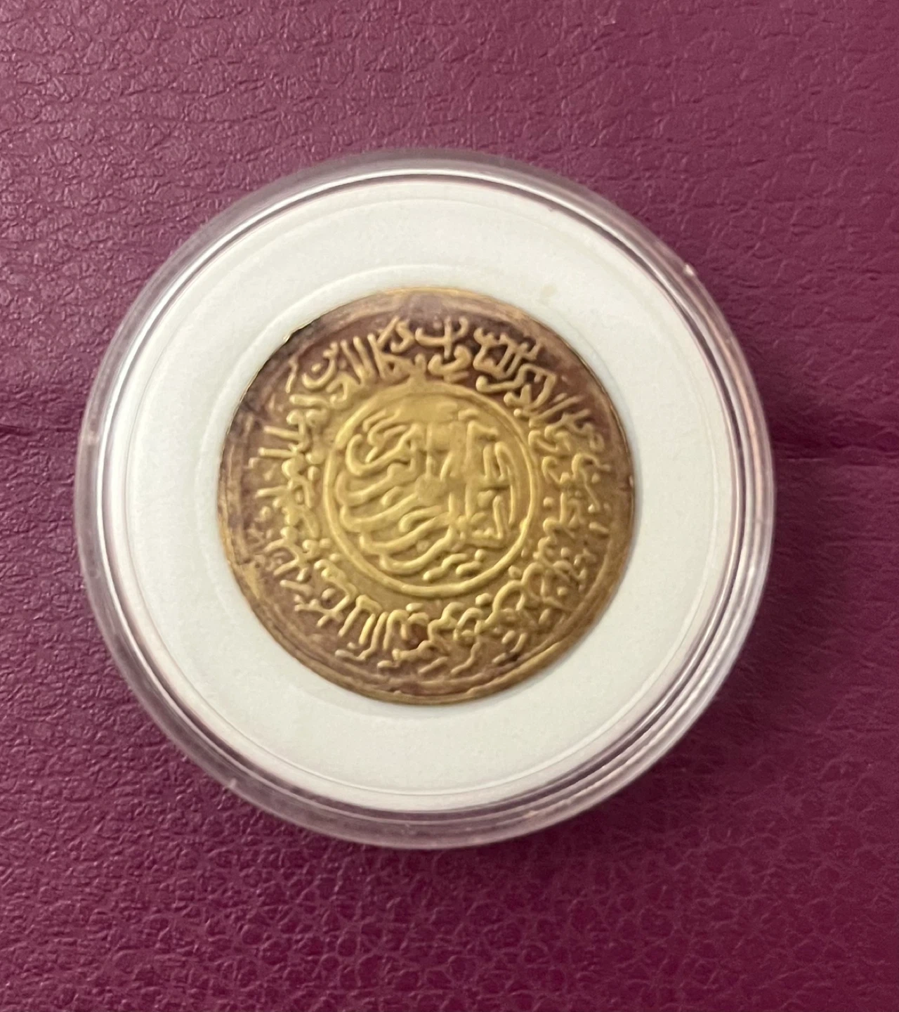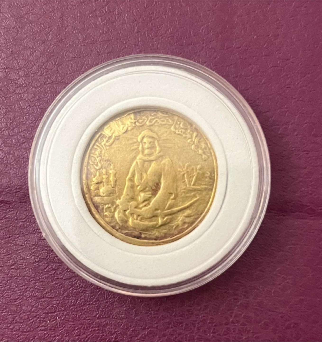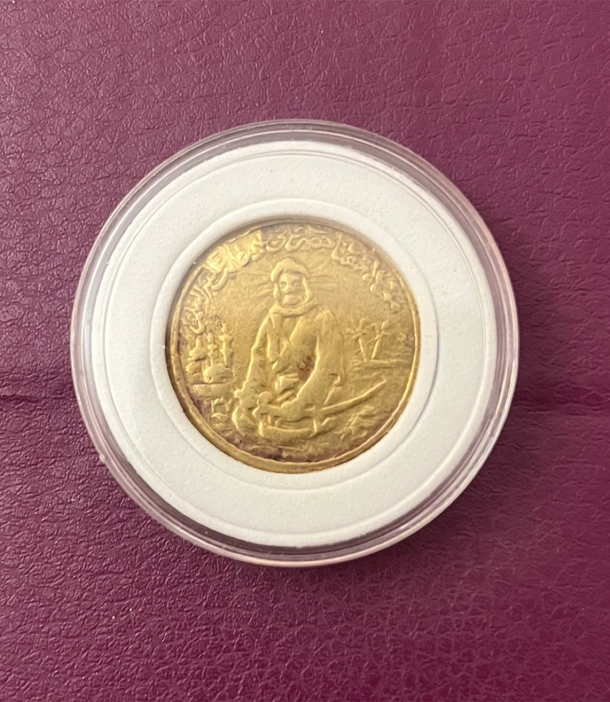 Selling a Beautiful Token coin 1918 Ali Ibn Abi Talib coin. It features a man holding a sword, palm trees, a Quran, and a mosque. It's in a protective case.