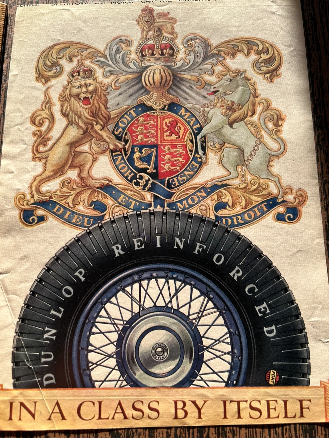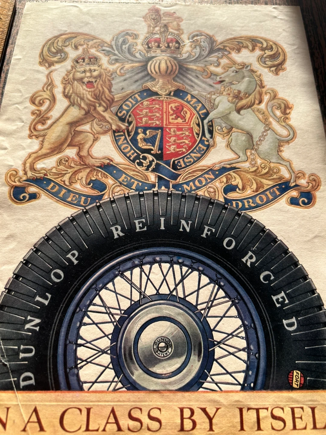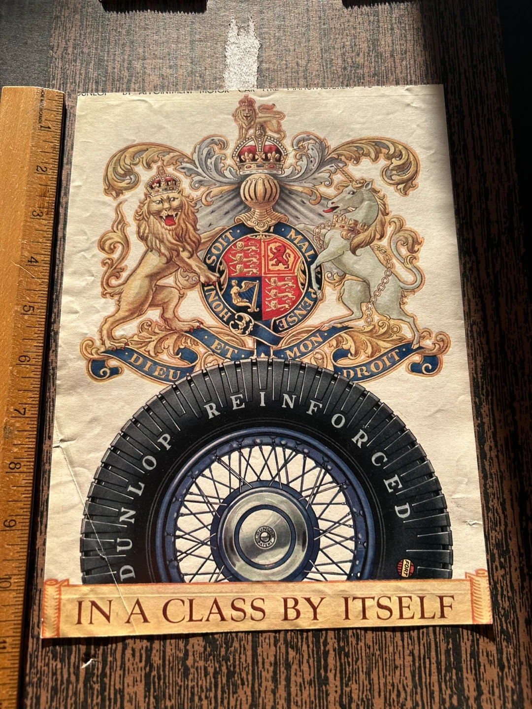 Advertisement for Dunlop tyres tires car vintage antique 1930s British heraldry Vintage Dunlop tires as with British crest Dunlop reinforced In a class by itself 15/00 Original ad not a reproduction See photos for condition which is generally good Flexible re pickup Elmsdale Road M4J 3M3 Donlands O'Connor East York Don Mills south exit off DVP