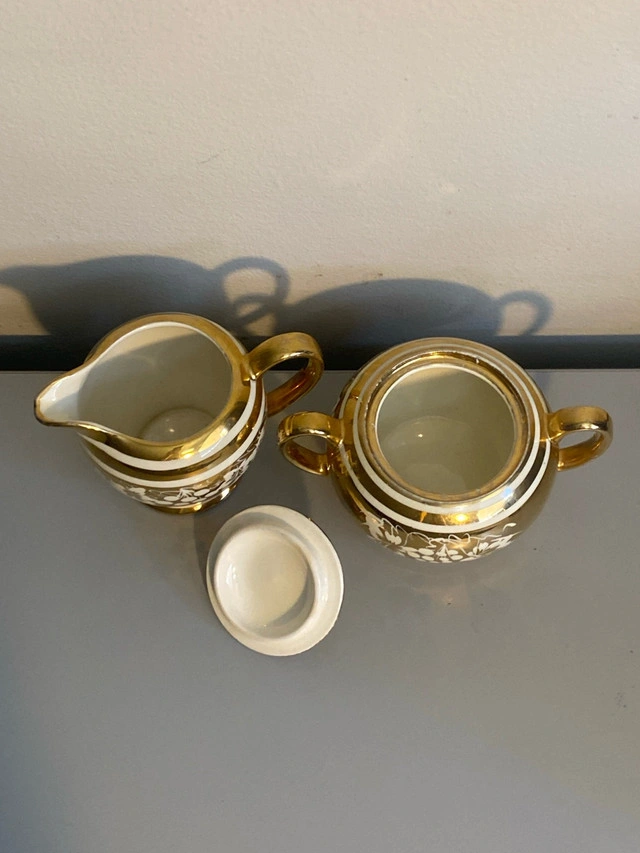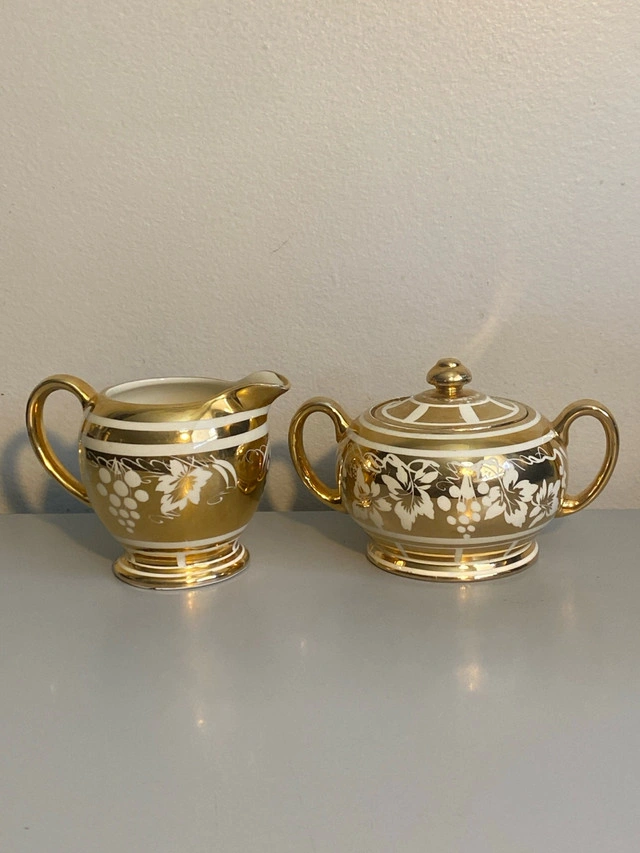 Elevate your tea service with this elegant, vintage Sadler cream and sugar set, featuring a luxurious gold design with delicate grape detailing. This used set includes a creamer and a sugar bowl with lid, perfect for adding a touch of sophistication to your table. Specifications: Brand: Sadler Material: Porcelain Design: Gold with Grape Detailing Includes: Creamer, Sugar Bowl with Lid Condition: Used Numbered: 1599J This set has been previously loved and has minor wear, which only adds to its vintage charm. It's ready to bring a touch of vintage elegance to your home!