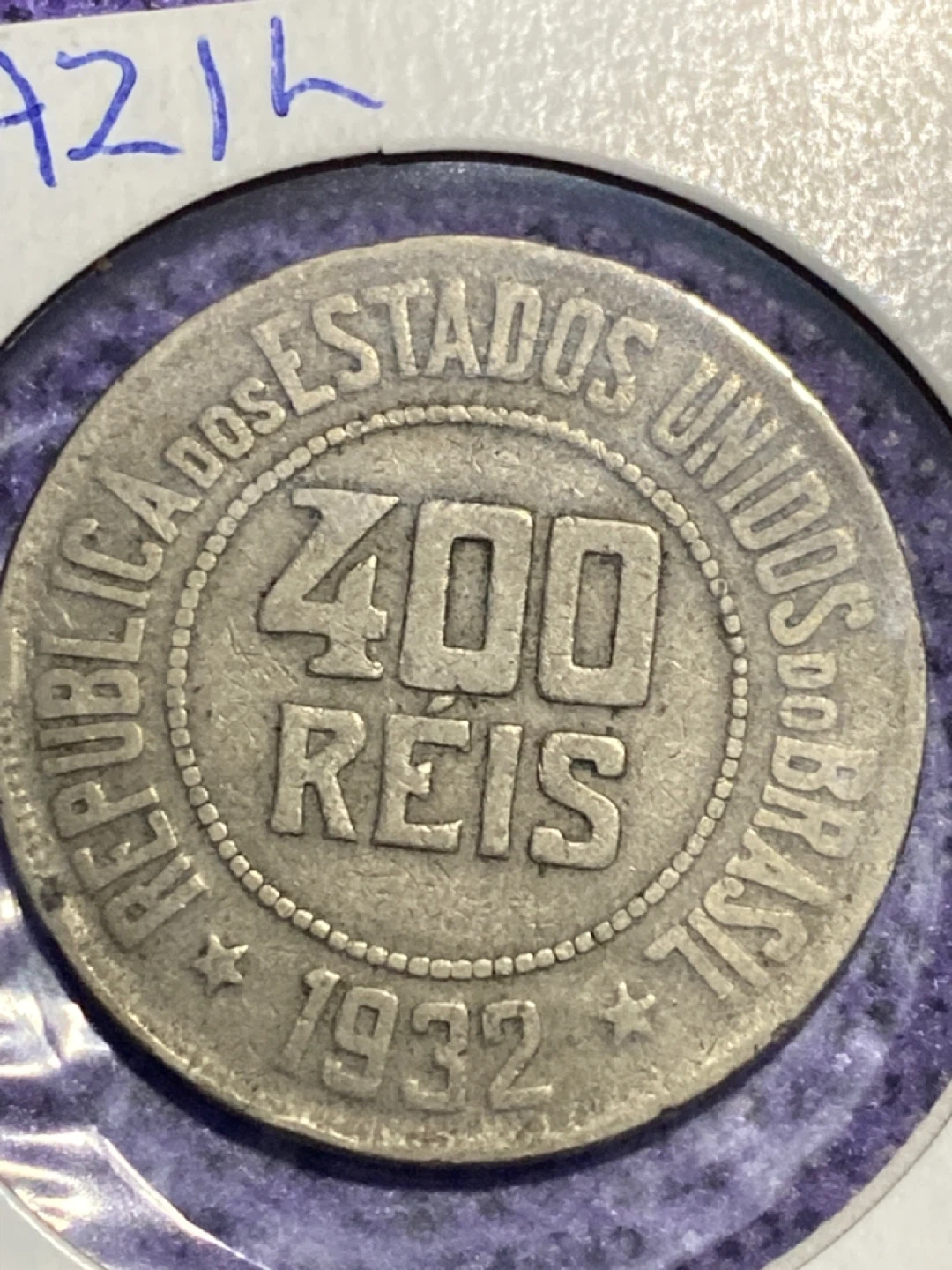 Selling a 1932 Brazilian 400 Reis coin. It has some wear, but it's in decent condition for its age. A great piece for any coin collector!