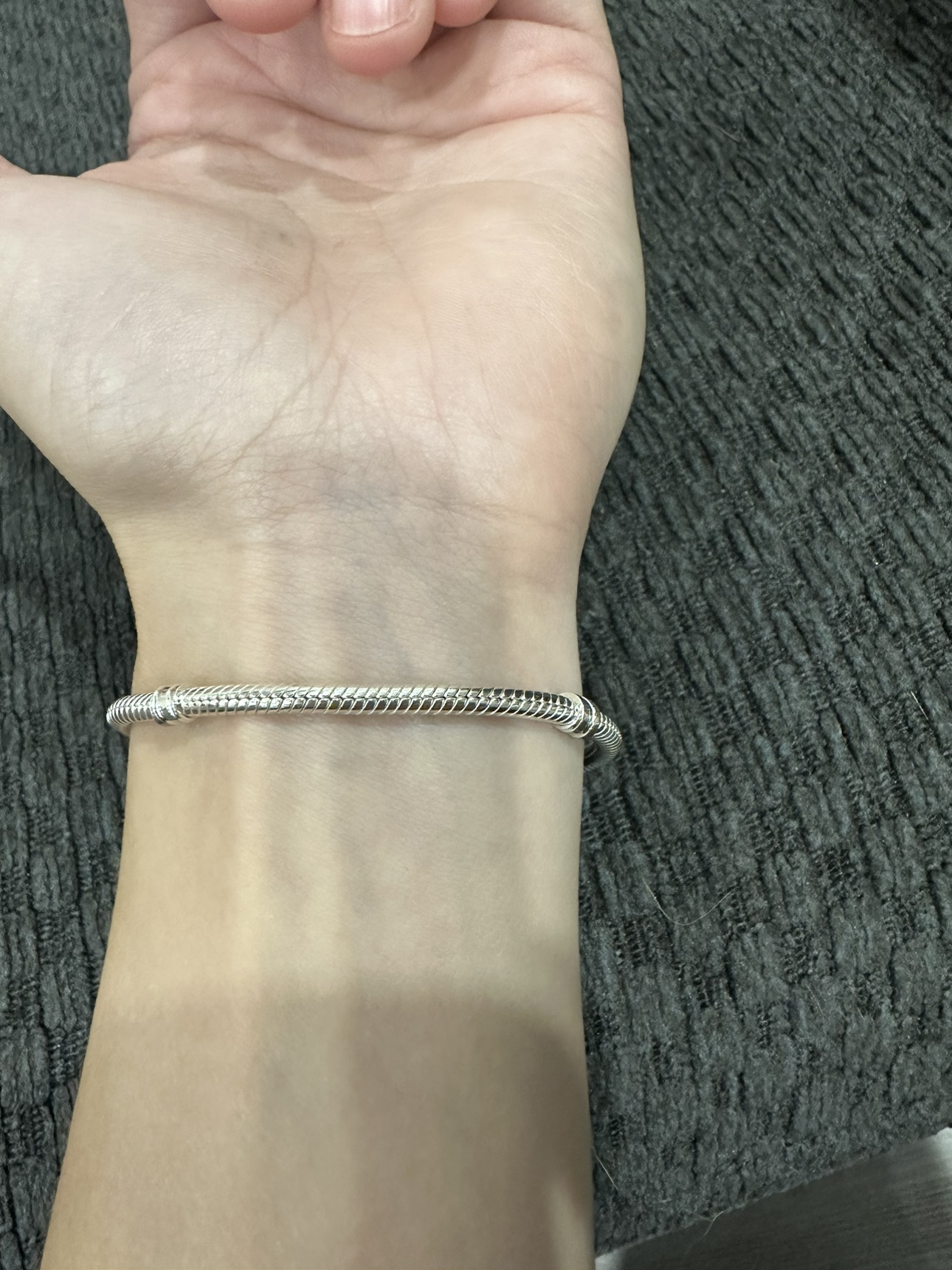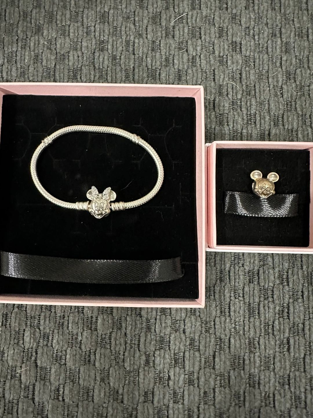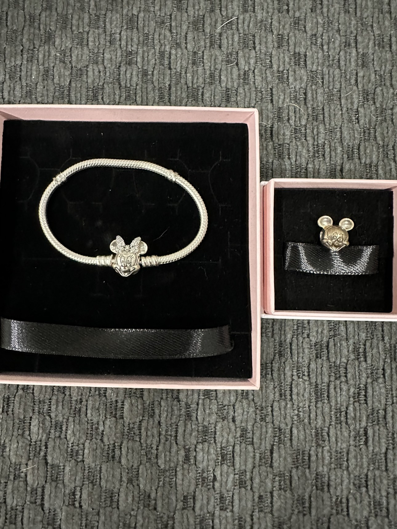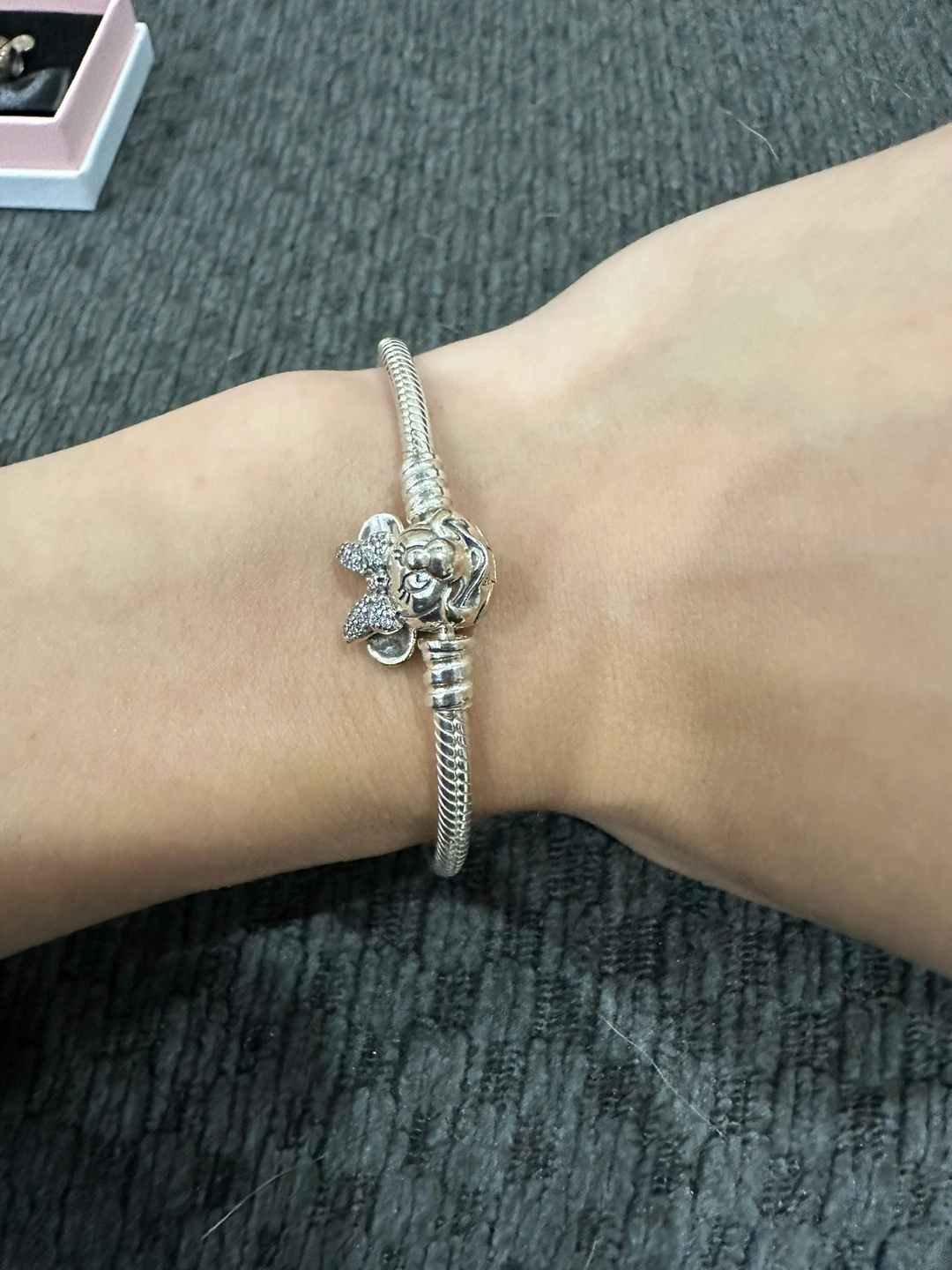 Sterling silver Pandora Minnie Mouse clasp snake bracelet, bow is made with clear cubic zirconia stones. Comes with Mickey Mouse charm, bracelet fits small sized wrist. Compatible with Pandora moments