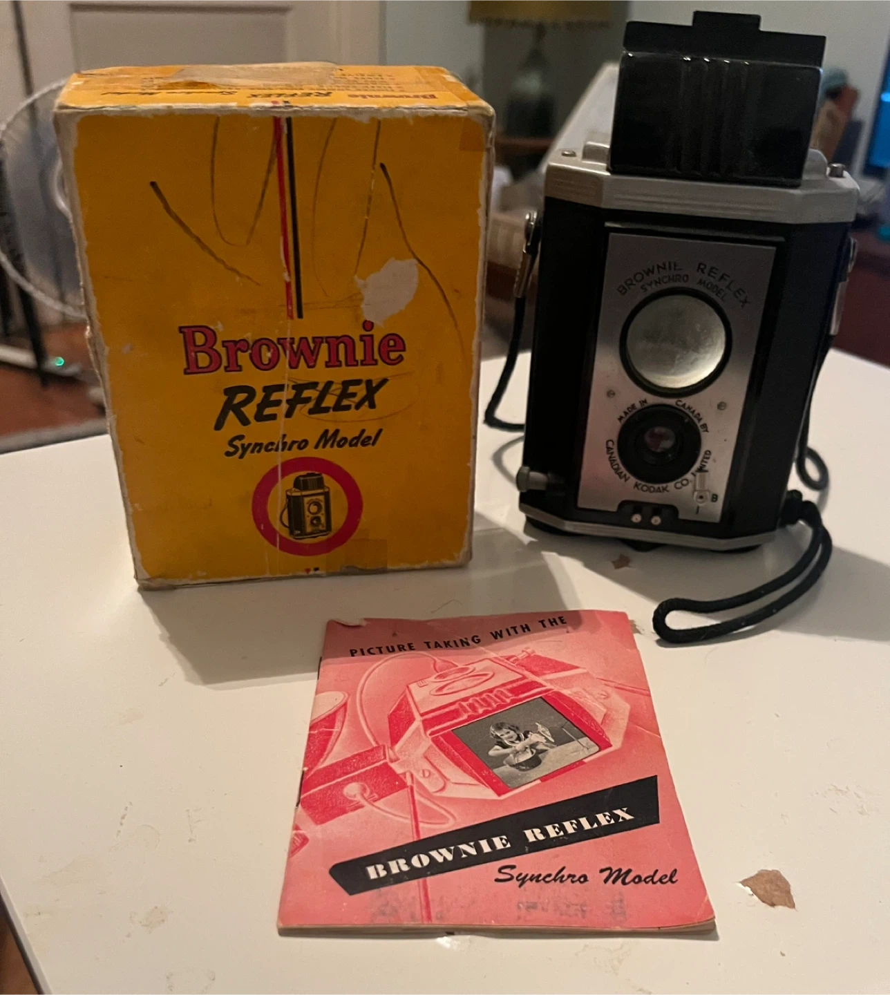Selling a vintage Kodak Brownie Reflex Synchro Model camera! It comes with its original box and a booklet about picture taking with the Brownie Reflex model. A great piece for collectors or photography enthusiasts Uses 127 roll film to produce 4x4cm exposures.