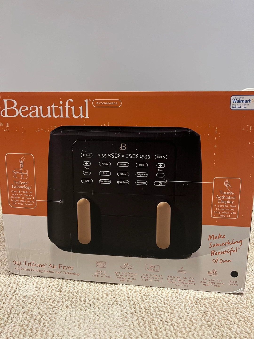 Brand new in box (never opened) cook 2 foods, 2 ways at the same time using separated baskets or 1 larger meal using the full basket by removing the center divider. Air fry, roast, reheat, dehydrate, bake or broil your favorite meals with Touch-Activated Display. Product description https://www.walmart.ca/en/ip/beautiful-9-quart-trizone-air-fryer-by-drew-barrymore-white-icing/6000205700309