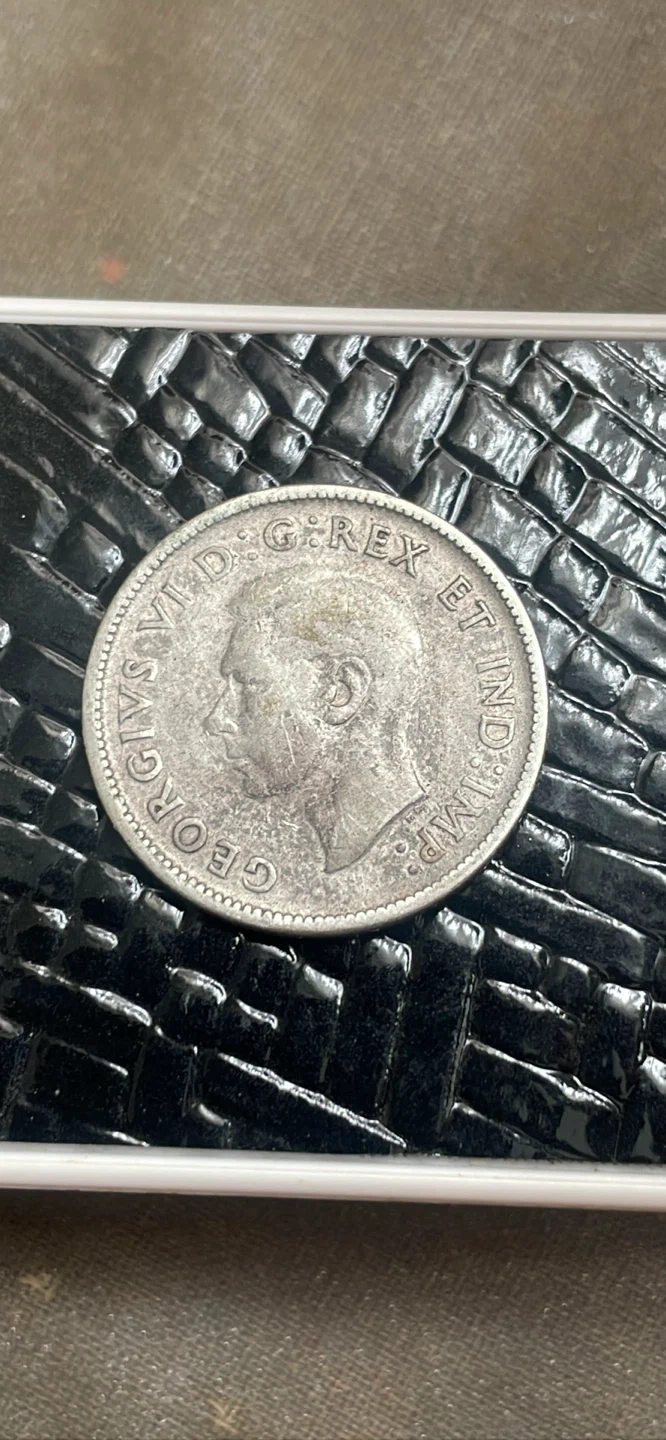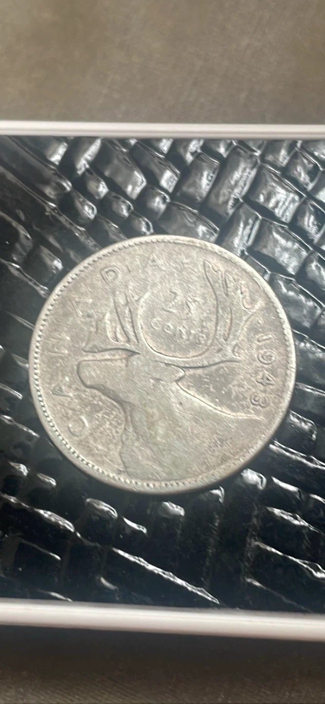 Selling a 1943 Canadian twenty-five cent coin, featuring King George VI on one side and a caribou on the other. A nice piece for any coin collector!