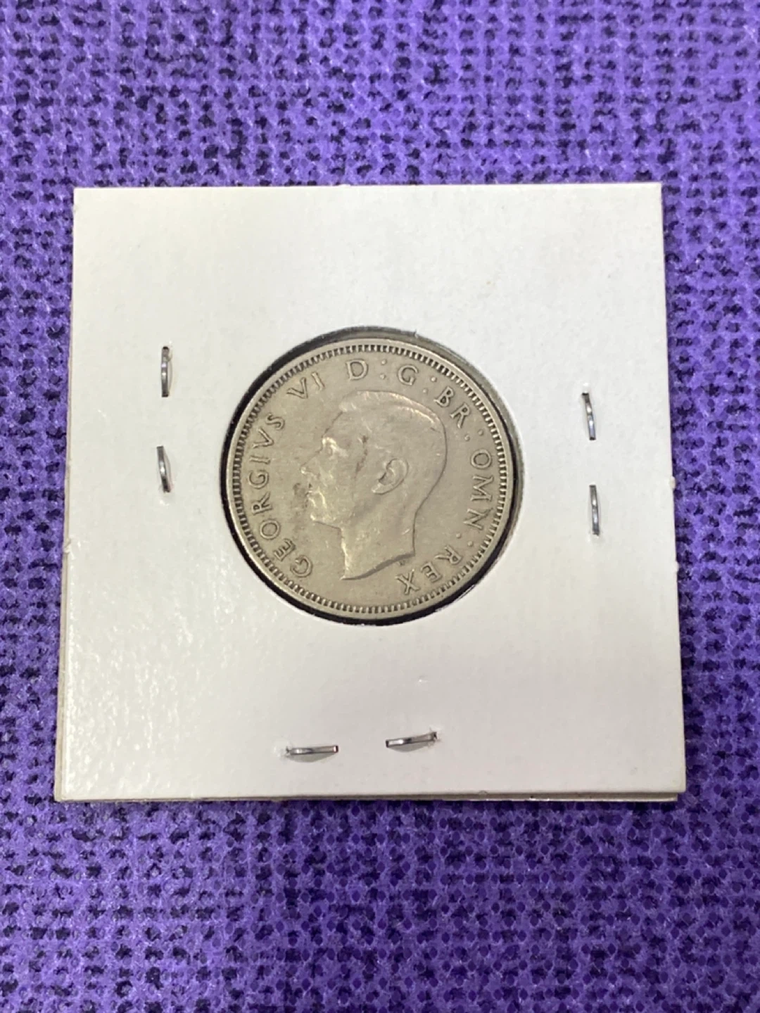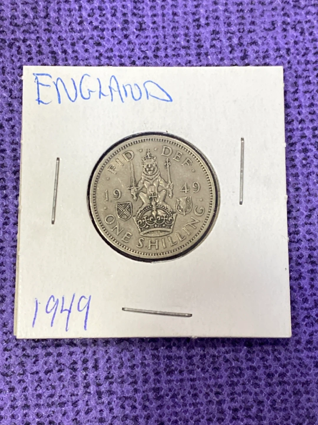 Selling a 1949 England One Shilling coin. It's in good condition for its age!
