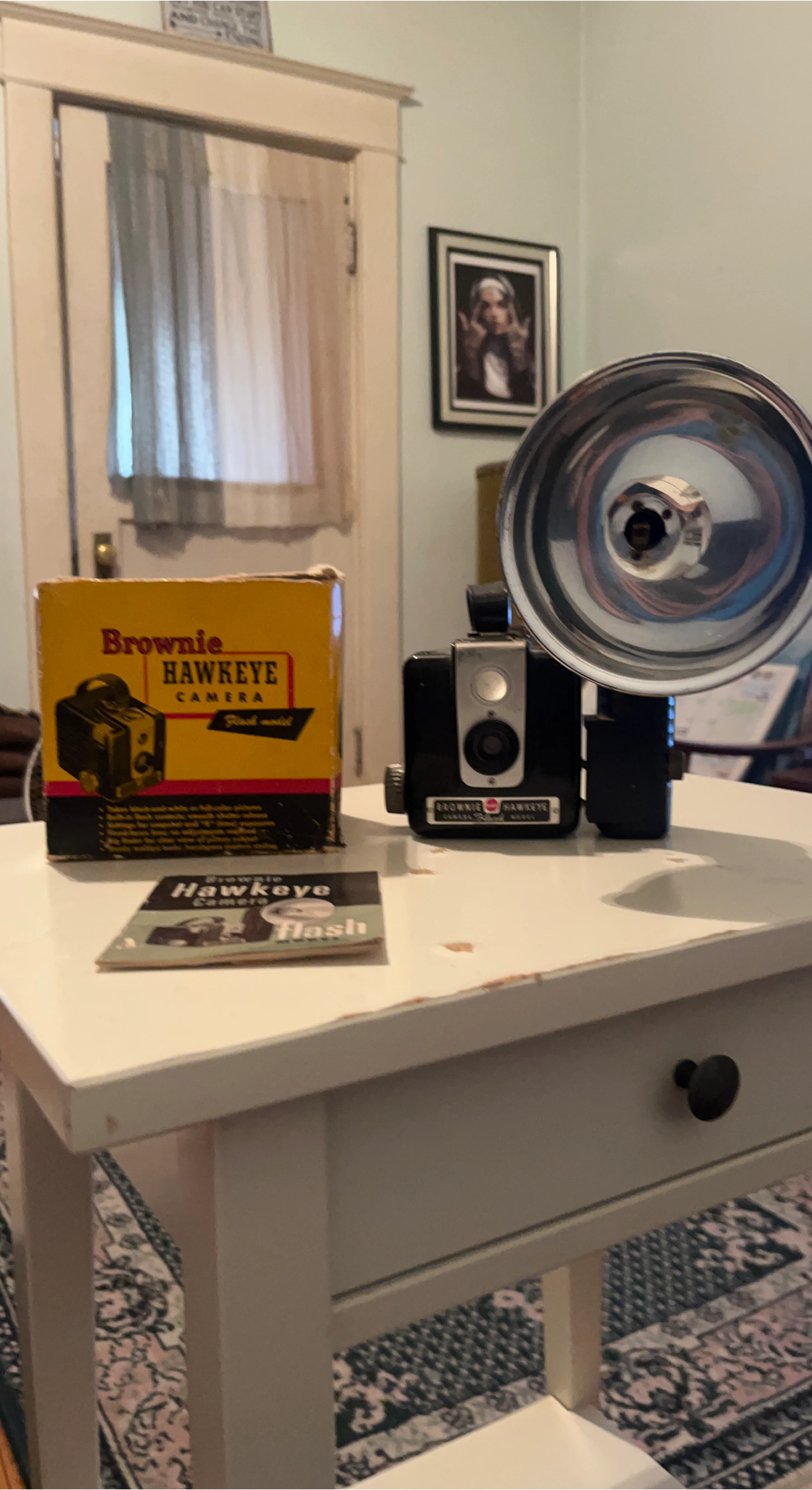 Selling a vintage Brownie Hawkeye camera. It comes with its original box and a Hawkeye flash attachment. A great piece for any camera collector! cash only please