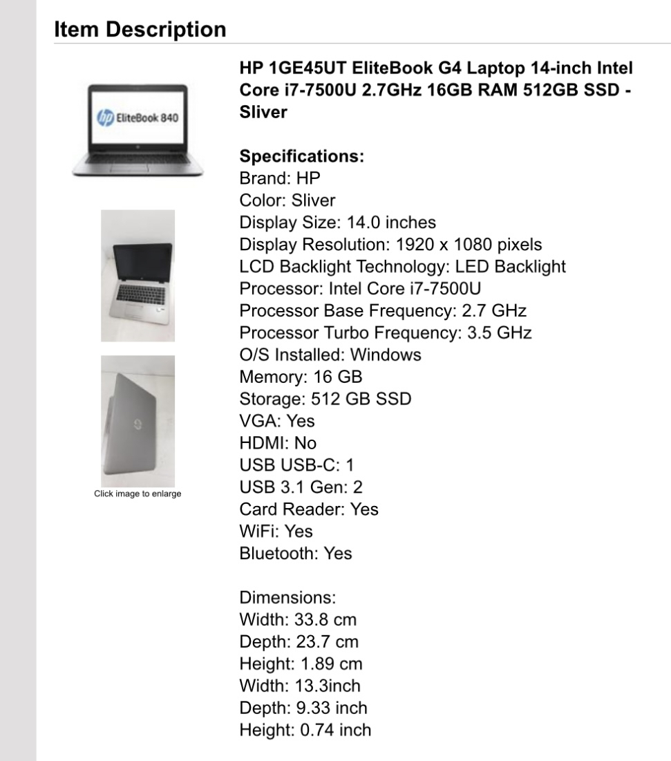NEW out of box! MSRP $2,209.00 + tax DISPLAY UNIT!! PRICE FIRM or FIRST COME! Items Included: Laptop Charger Online manual Specs: Intel Core i7-7500U 2.70 GHZ 512GB SSD 16GB RAM Windows 10 Pro Intel UHD Graphics 620 Unit has been tested and is fully functional. Minor scratches on body and screen due to customer contact. Minor screen scratches are not visible when screen is on. Tab key worn out. HP has common issue where some function keys have hotkey popup. At time of testing, battery is holding a good charge but battery life cannot be guaranteed. OEM box not included. Pay via Cash, Credit, e-transfer, crypto, Apple Pay, & MORE! **Delivery and Shipping is possible depending on location and small fee. Delivery and shipping fees must be paid in advance by you regardless of purchase** https://texas.gs.shi.com/product/33168091/HP-EliteBook-840-G4-Core-i7-7500U-2.7-GHz Caveat emptor It is the duty of the buyer to inspect, test, and agree to our products prior to completing transaction. You accept full responsibility of the product the second money exchanges hands even if you choose to not test and inspect. If the unit is factory sealed and you decide to break the seal to inspect and test, you agree to complete the sale as long as the product inside is in adequate condition.