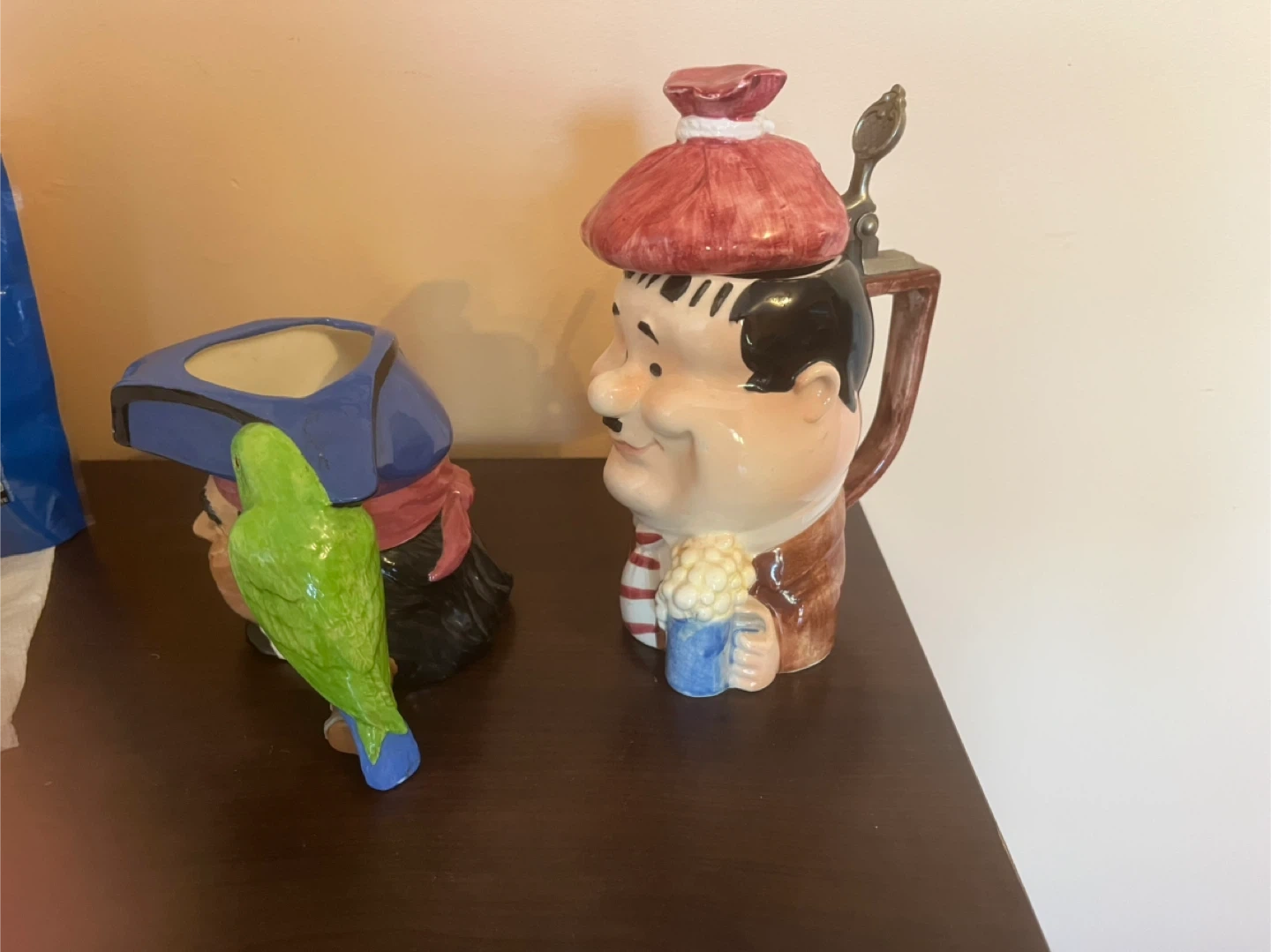 Both 50 dollars best offer accepted Here are two unique stein mugs. One is a character wearing a red hat and holding a beer. The other is a pirate with a parrot. They would make a fun addition to any collection!