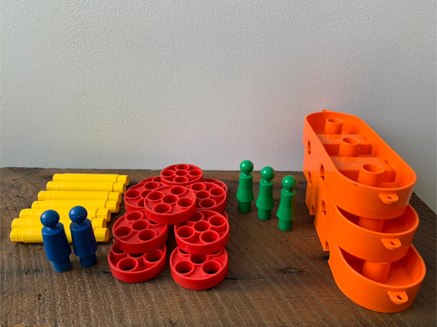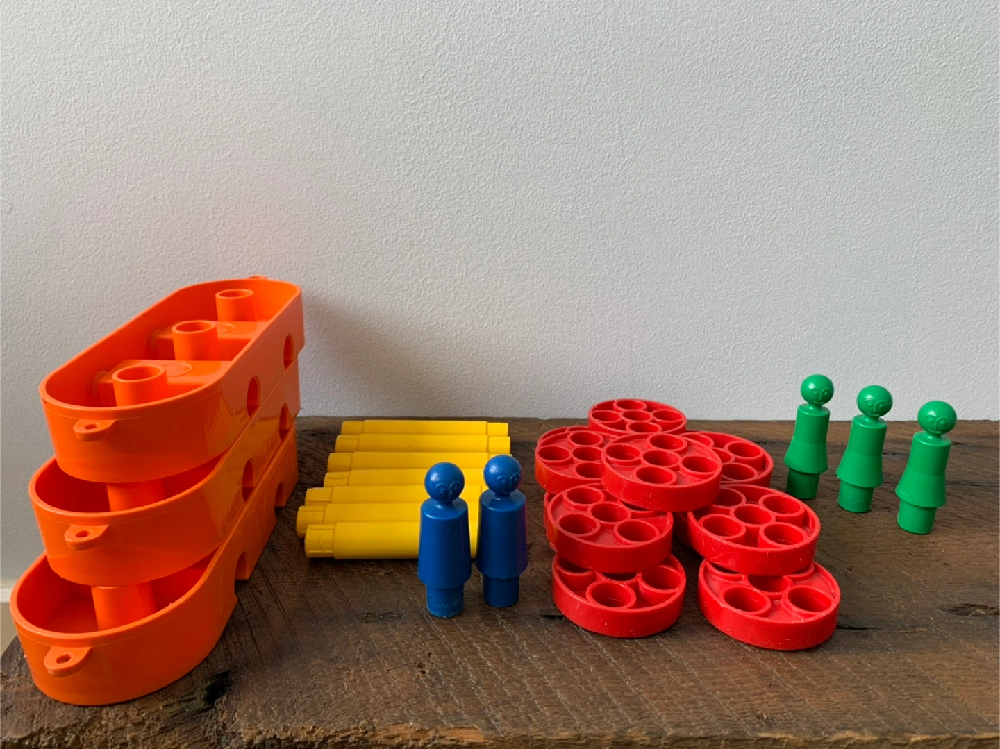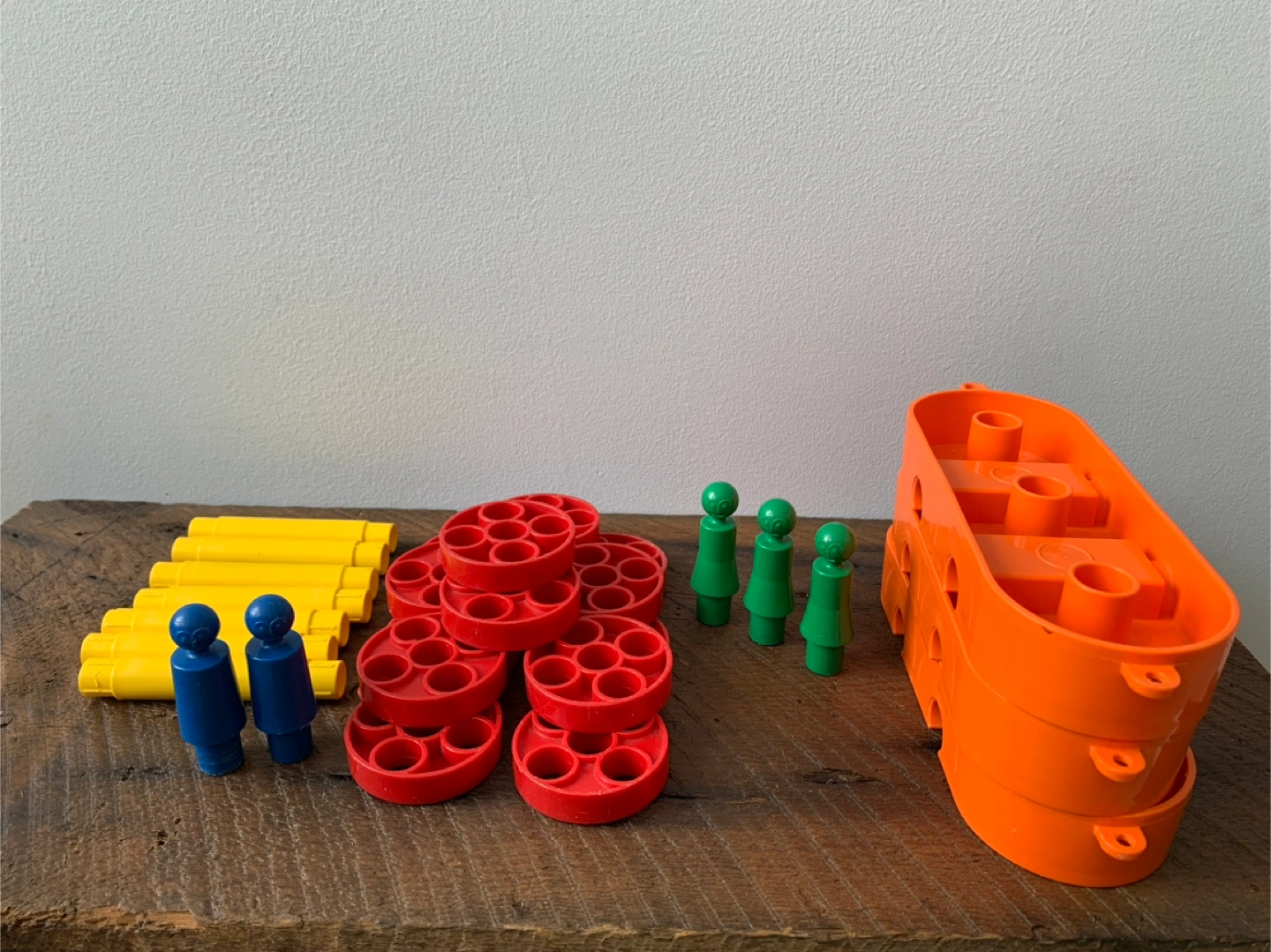 A vintage Tupperware play set! Includes various colourful pieces for building and creating, inside, outside or even in the tub which was where my kiddo enjoyed it most. Great for imaginative play and early learning for kids! Set includes: 3 orange boat/car bases 5 people 13 red wheels/umbrellas 7 yellow axles/posts