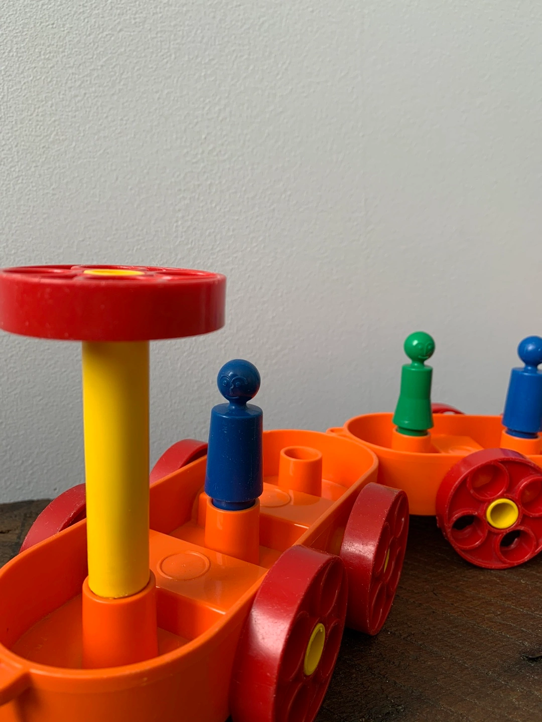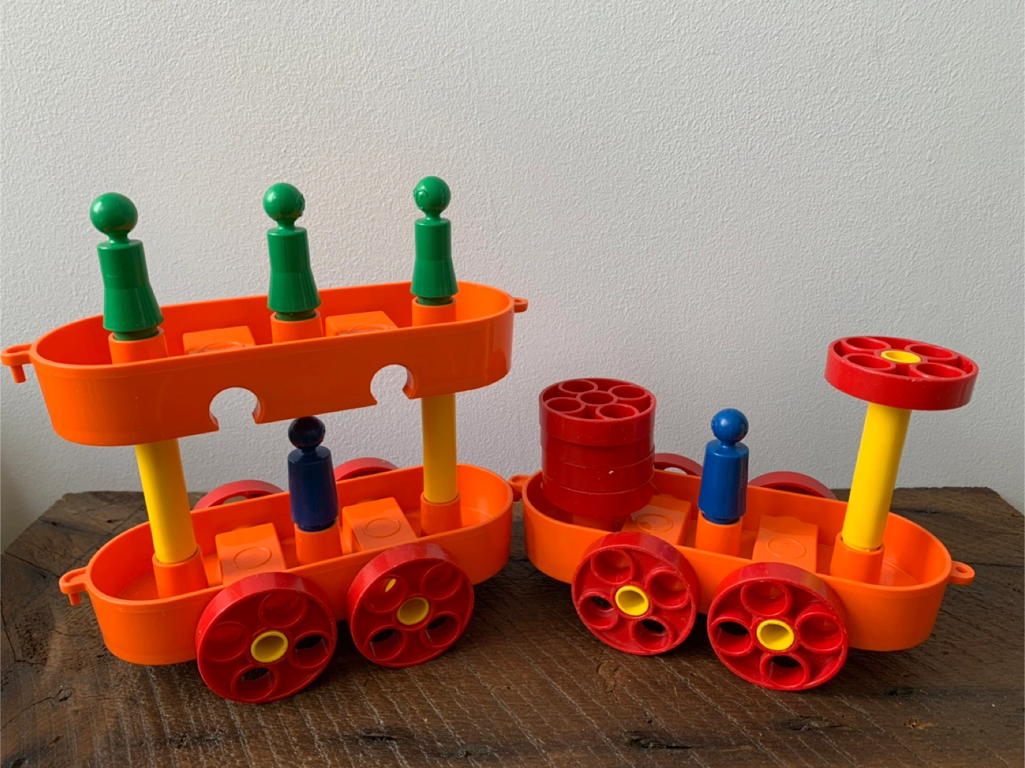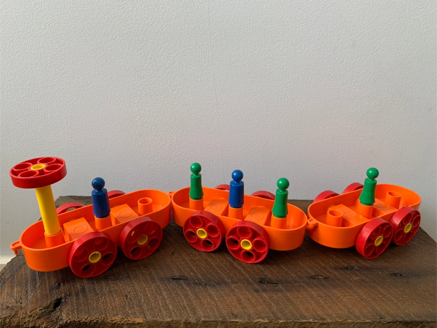 A vintage Tupperware play set! Includes various colourful pieces for building and creating, inside, outside or even in the tub which was where my kiddo enjoyed it most. Great for imaginative play and early learning for kids! Set includes: 3 orange boat/car bases 5 people 13 red wheels/umbrellas 7 yellow axles/posts