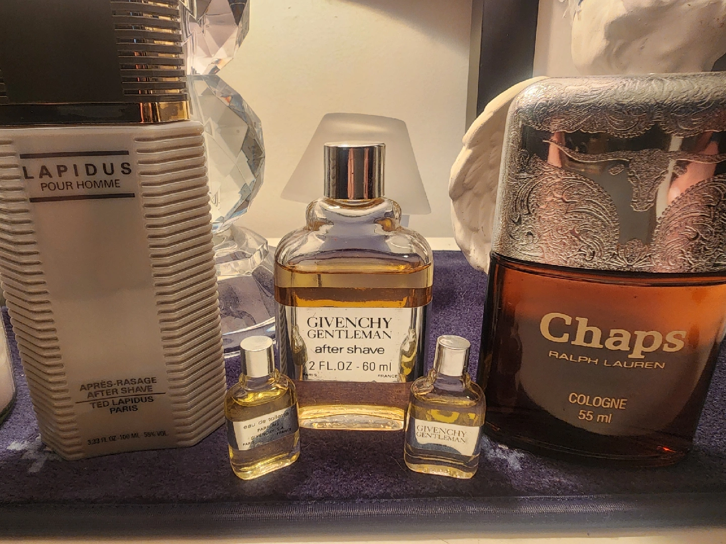 A vintage perfume collection featuring Ted Lapidus, Givenchy Gentleman, and Chaps Ralph Lauren, each bottle with its unique scent profile. * Ted Lapidus By Houbigant Pour Homme Apres-Rasage After Shave 3.33 fl oz - 100 ml Original Formula Full Bottle * Givenchy Gentleman After Shave Original Formula 2 fl.oz - 60ml Slightly Used with 2 small full miniature bottles * Chaps Ralph Lauren Cologne 55 ml, Full Bottle These scents have been carefully stored and are looking for a new home. If you see this ad, the perfumes are still available, ready to add a touch of classic aroma to your collection!
