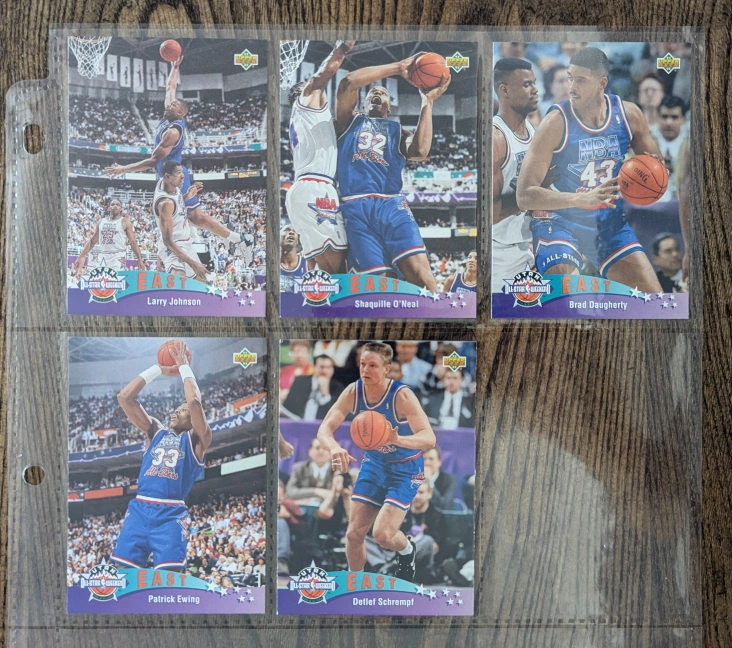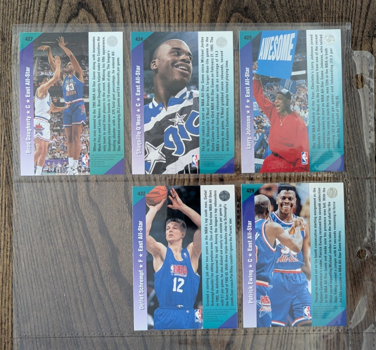 Selling a collection of vintage 1993 NBA All-Star trading cards! These cards feature iconic players like Larry Johnson, Shaquille O'Neal, Brad Daugherty, Patrick Ewing, Detlef Schrempf, Sean Elliott, David Robinson, Karl Malone, Terry Porter, and Shawn Kemp. Pre-owned, in very good shape. Pickup Thanks for looking