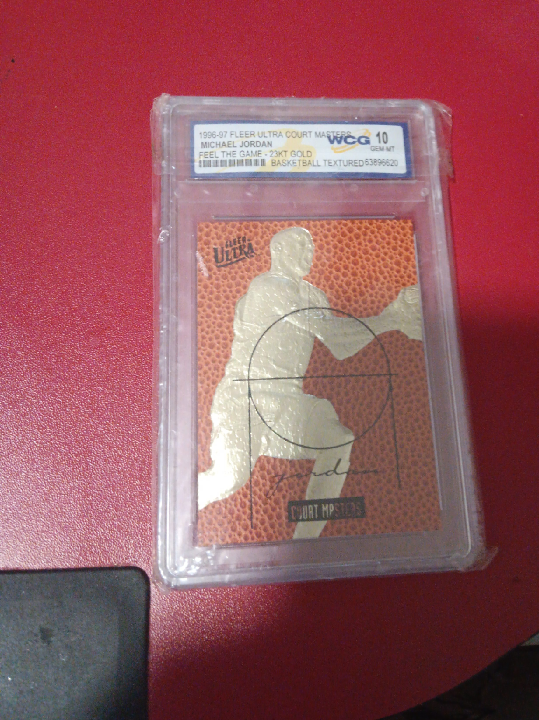 Selling a 1996-97 Fleer Ultra Court Masters Michael Jordan basketball card. It's a textured card with 23KT gold accents and has been graded as a WCG 10 GEM MT!