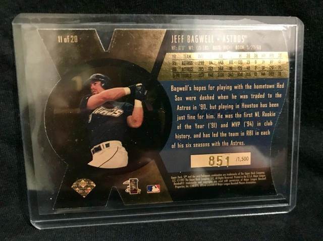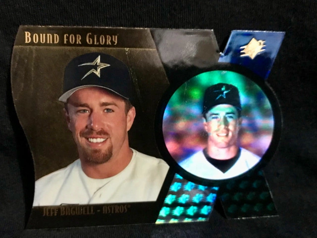 Capture a piece of baseball history with the 1997 SPx Bound for Glory card featuring Hall of Famer Jeff Bagwell. Numbered at 851 out of 1500, this collectible highlights Bagwell's remarkable career with the Houston Astros, encapsulating the essence of his on-field prowess during the '97 season. Crafted by Upper Deck, this trading card is a must-have for enthusiasts and fans of the sport. With its serial-numbered attribute, it stands as a unique piece of memorabilia that commemorates Bagwell's legacy in Major League Baseball. Add this to your collection and own a snapshot of baseball greatness. Condition: New More Info: Sports Collectibles Cashless payment: Yes For Sale By: Owner Curbside pick up: Yes Cash accepted: Yes Payment: Cashless payment, Cash accepted