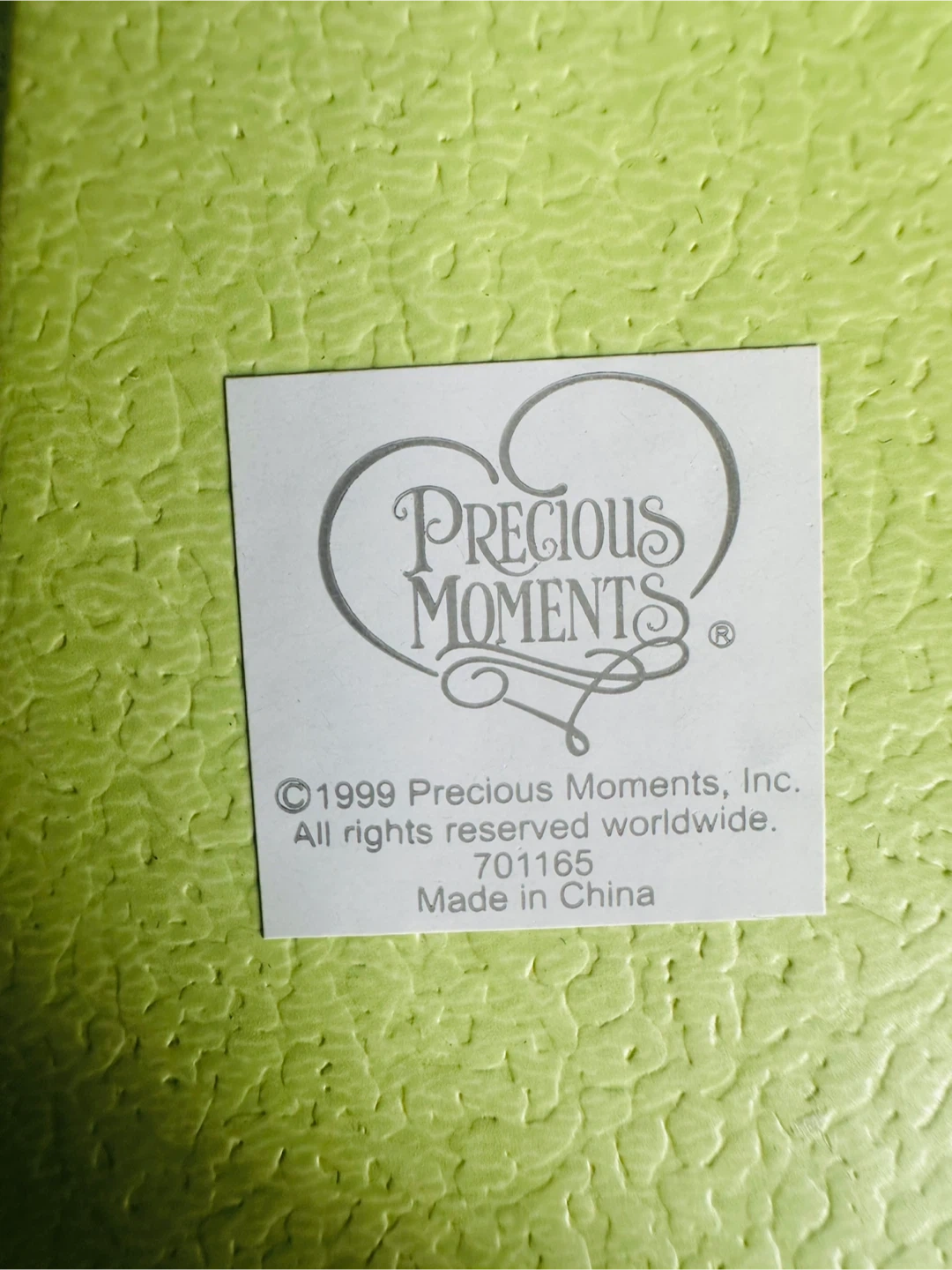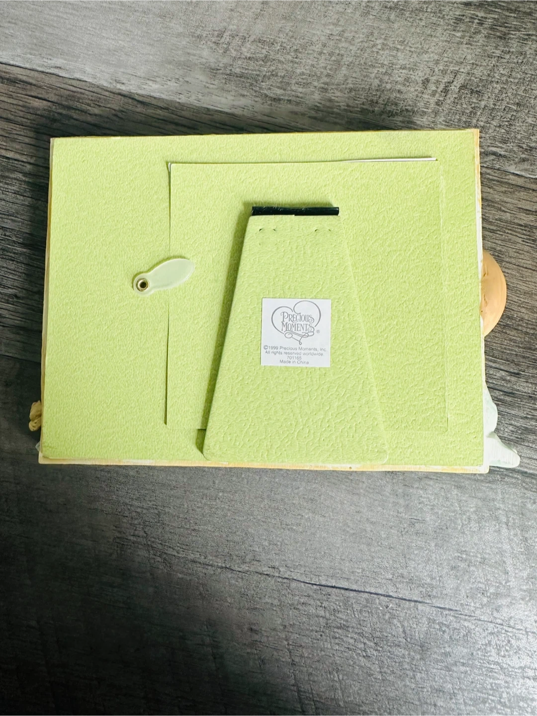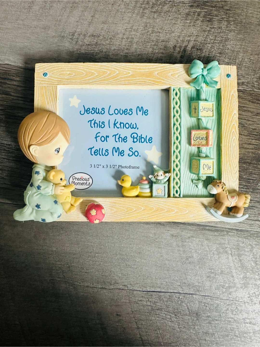 A sweet Precious Moments photo frame featuring a child figurine and the words 'Jesus Loves Me'. It's designed for a 3 1/2" x 3 1/2" photo. Perfect for a nursery or as a thoughtful gift!