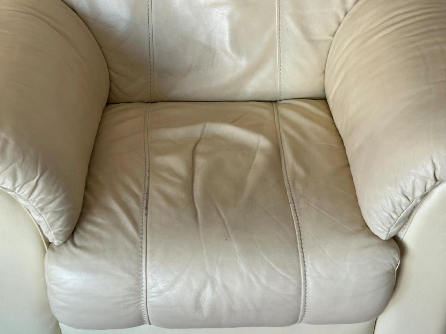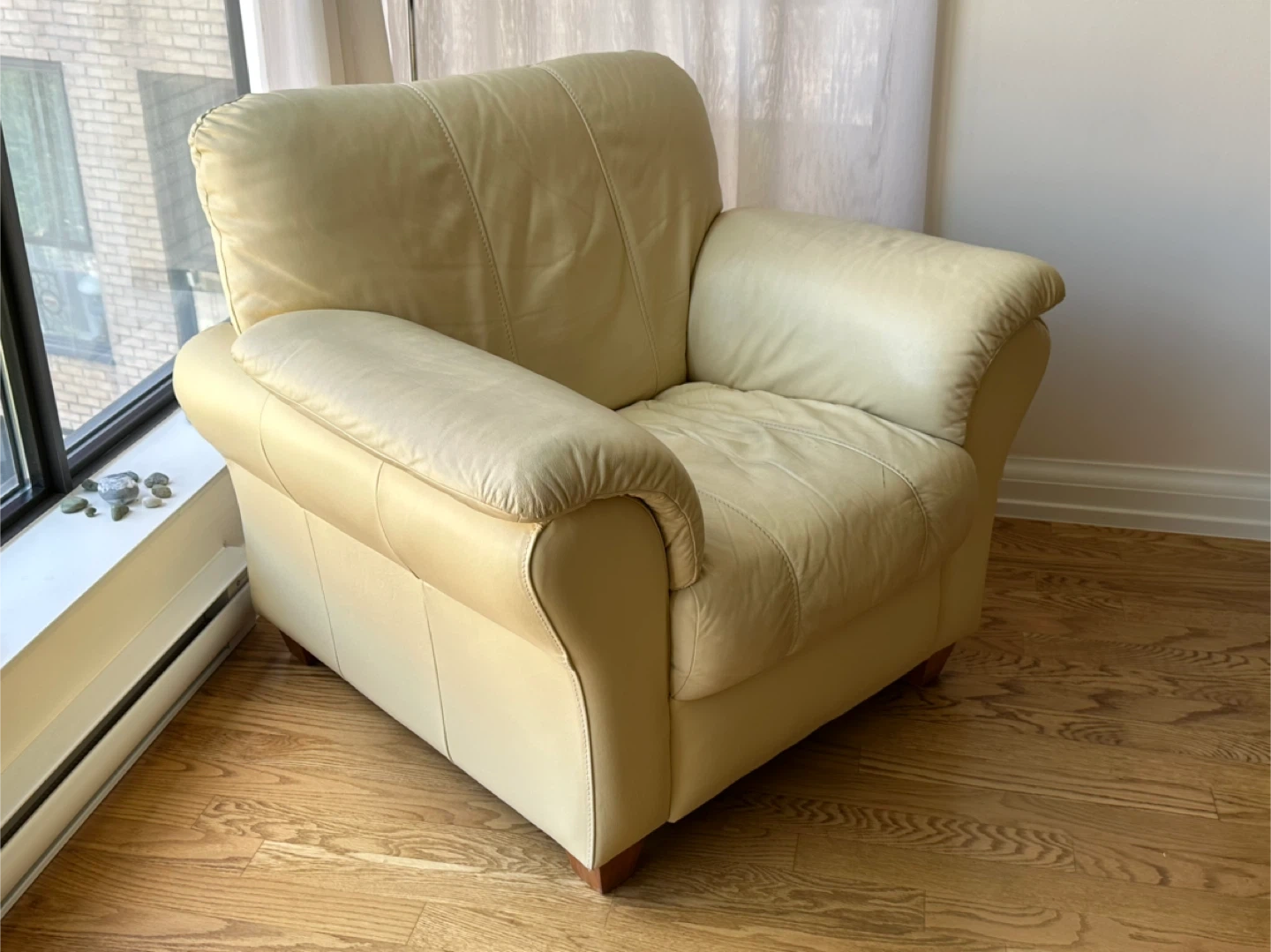 Selling 2 oversized Butter Cream-coloured leather armchairs in good condition. There are obvious sign of use on both of the seats of the armchairs but the rest of the leather is in great condition. Please see the photos. They are super comfortable. The measurements are as follows: Height: 37” Width: 43 1/2 “ Depth: 36 1/2 “ Price is $200 for the 2. Pickup only. We are located near the St Lawrence market area of downtown Toronto. SF and PF. Welcome to view in person before committing. Cash only.
