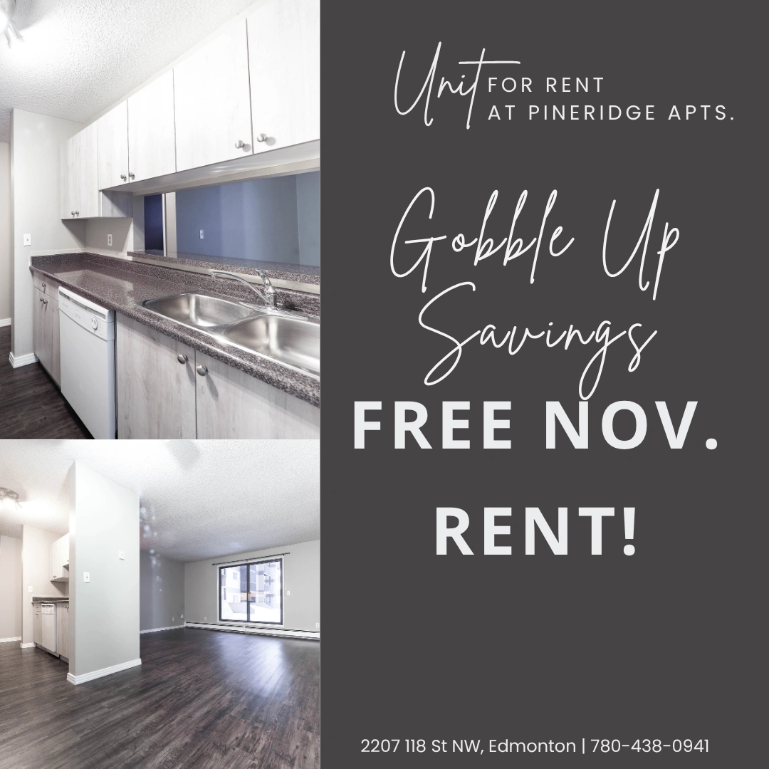 ** NO RENT IN NOVEMBER!** Address: Pineridge Apartments, 2207 118 St NW, Edmonton, AB T6J 6L8 Rent: $1,495/month* Security Deposit: $800 Parking: 1 energized stall included Utilities Included: Heat and Water Laundry: On-site laundry facilities **NO PETS ALLOWED** Enjoy modern and convenient living at Pineridge Apartments — a well-maintained building featuring excellent amenities such as a common-use gym, social room, and an outdoor pool. Located near popular restaurants, shopping centers, grocery stores, and major bus routes for easy commuting. Each renovated unit offers a spacious kitchen and dining area, laminate flooring, and 3 appliances (dishwasher, fridge, and stove). On-site laundry facilities are available for your convenience. Images shown are for advertisement purposes only and may not reflect the exact unit layout. *Rent listed applies when signing a 12-month lease. Interested in viewing this property or have questions? Contact Shreshtha @ 780-438-0941 today to schedule a showing or get more details.