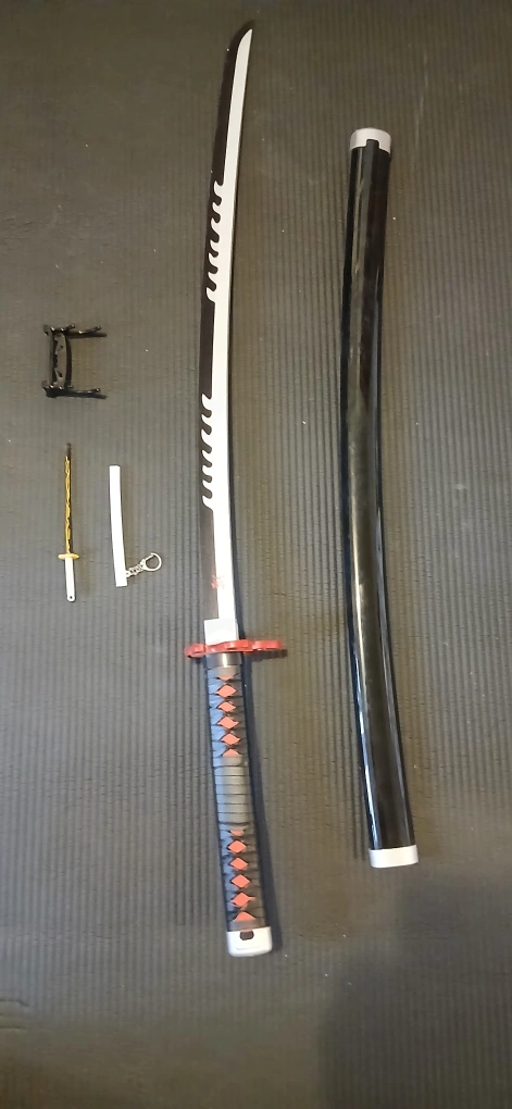 Selling 2 demon slayer swords. Life sized Tanjiro katakana and a mini Zenitsu katana. Both come with a sheath. Mini katana comes with a holder. The blade for the life sized one is bamboo and for the mini one is metal.