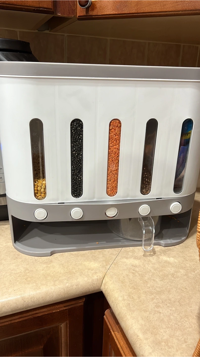 Here's a handy dry food dispenser for your kitchen! It has multiple compartments to keep your lentils, beans, or other dry goods organized and easily accessible
