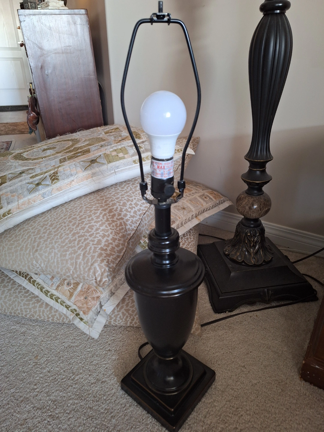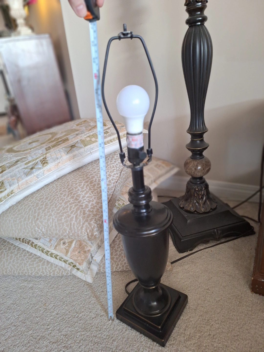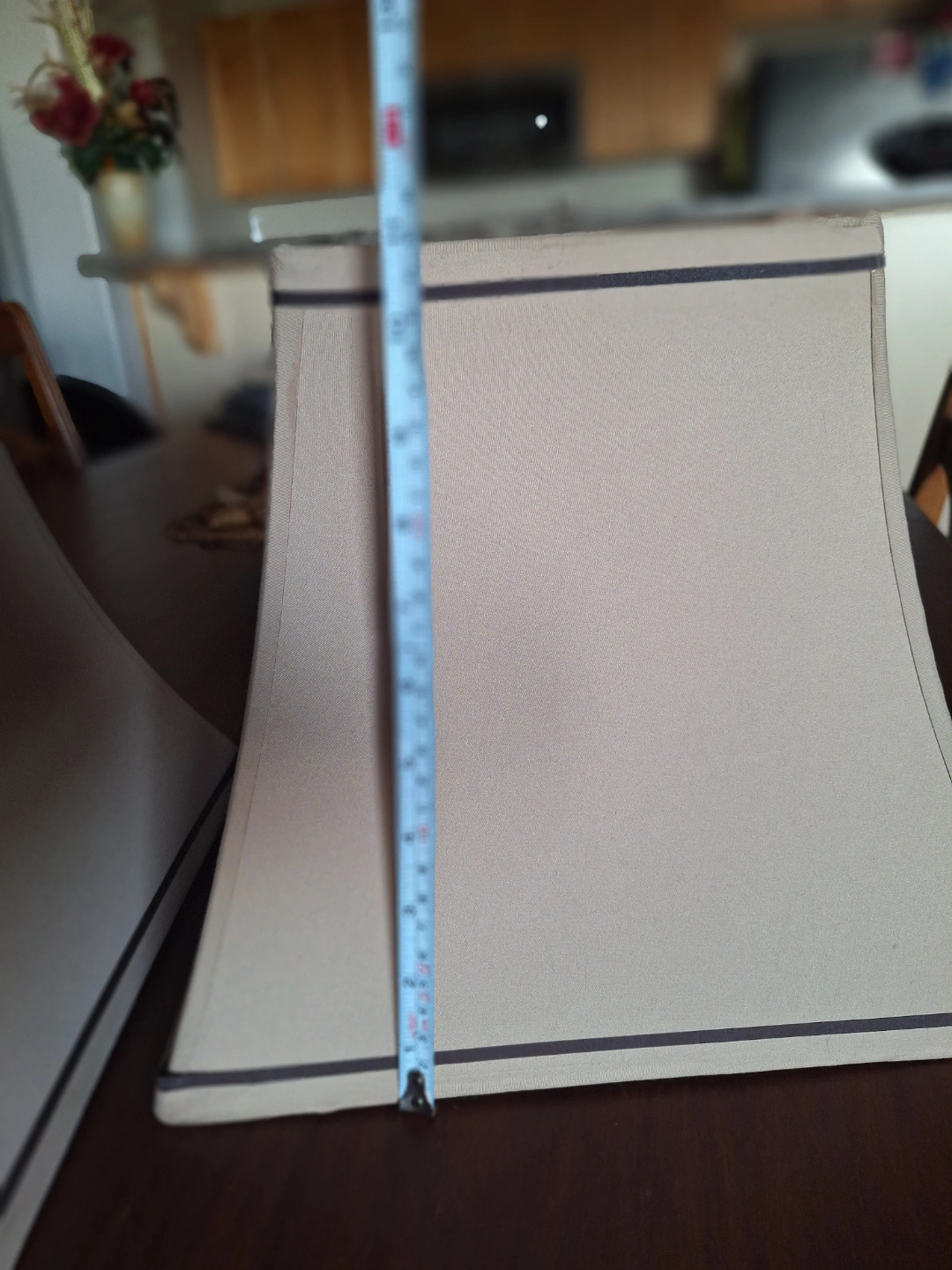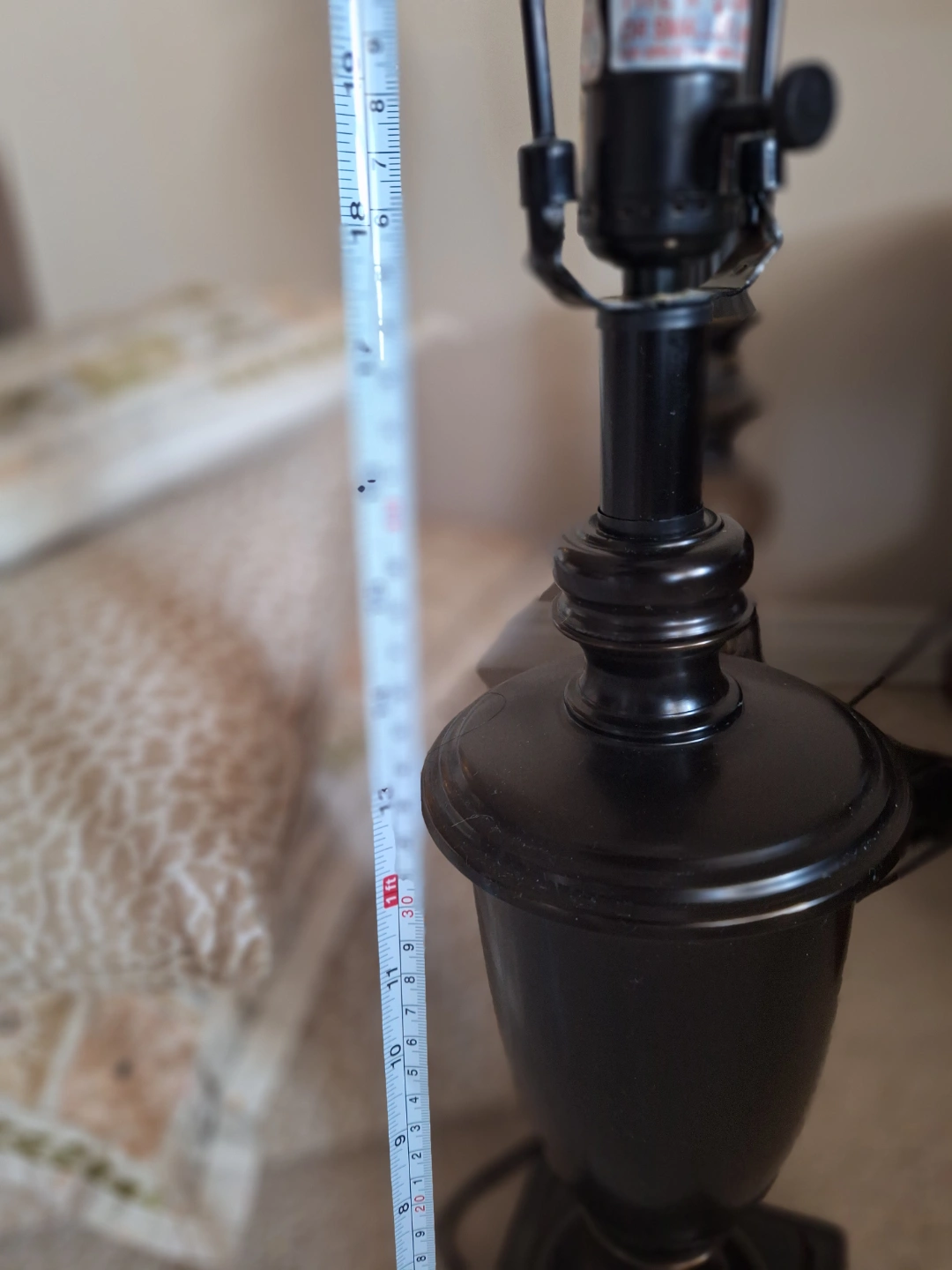 2 x Beautiful table lamp, dark bronze finish. Includes beige square lampshades with dark brown trim. Great for a bedside table or living room. Dimensions in pictures $70 for BOTH. being sold as a set