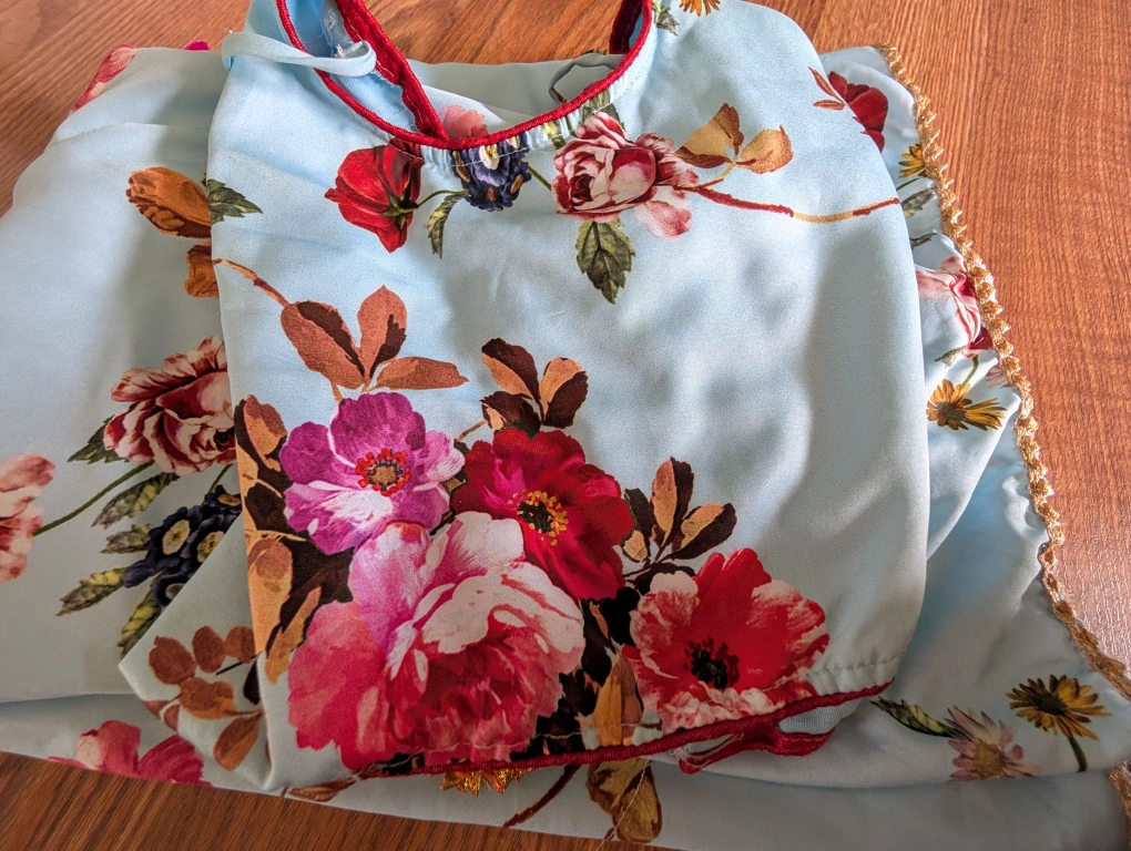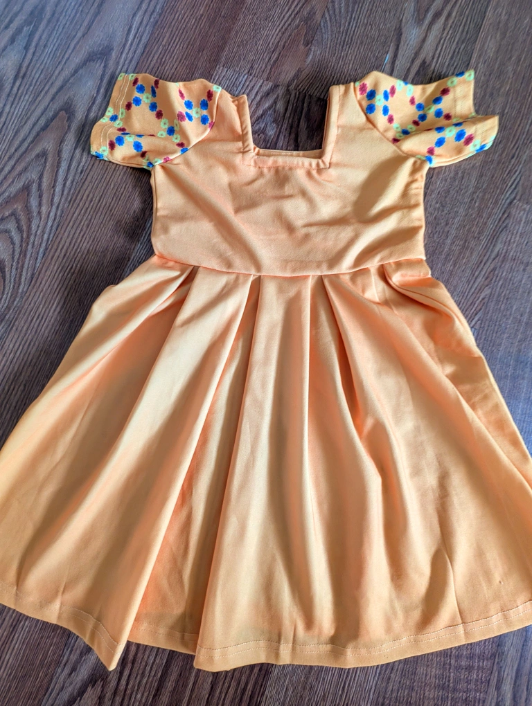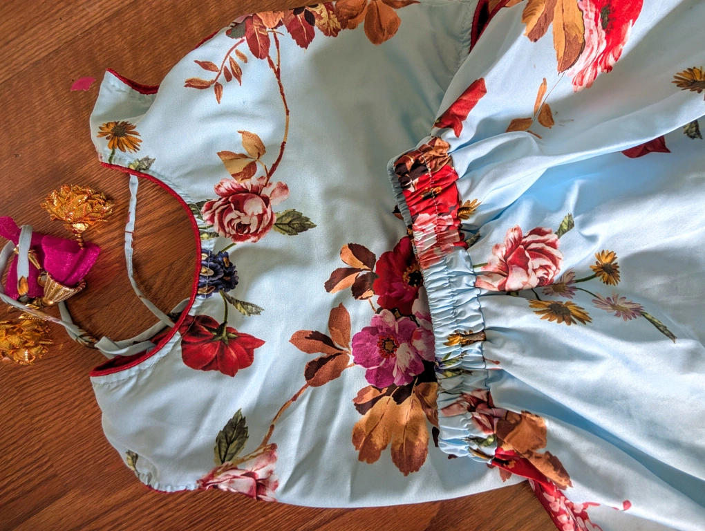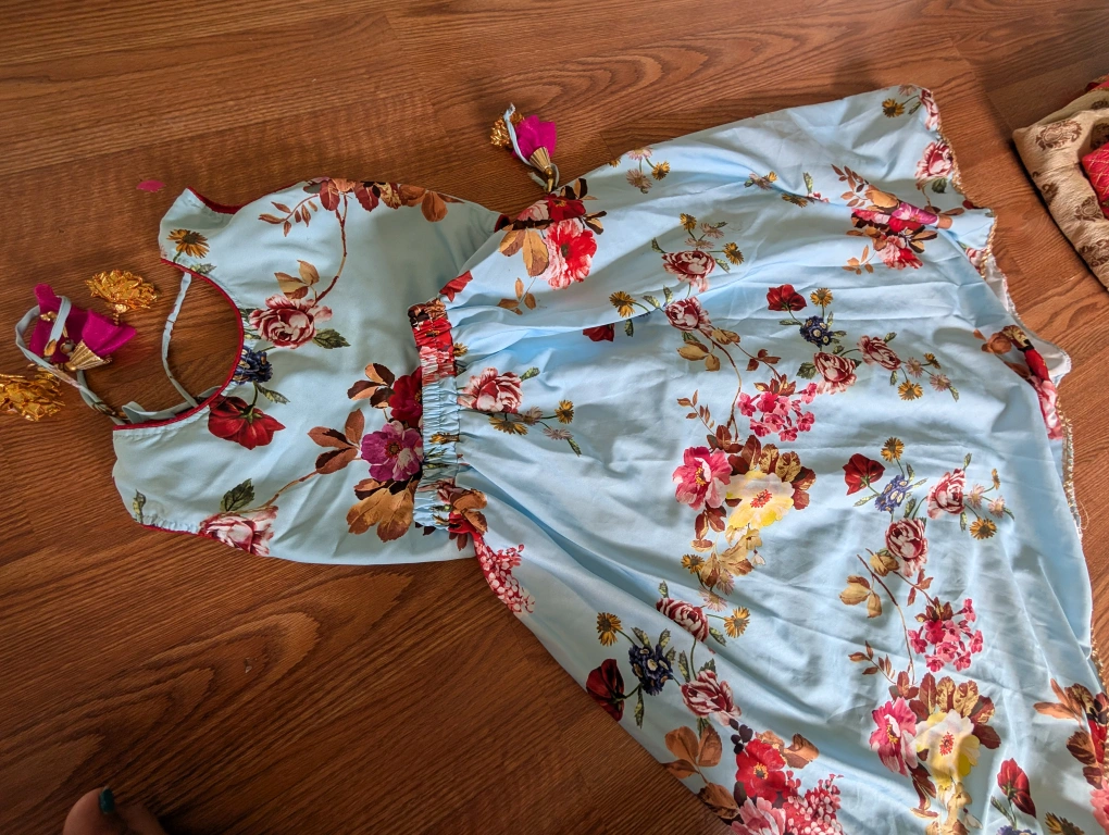 I'm selling a cute floral dress! It features a light blue fabric with a vibrant floral print. Perfect for a sunny day out or a special occasion. The size is not specified, but it appears to be for a young child. The dress has a lovely design and is in good condition