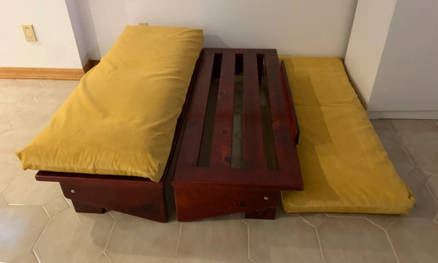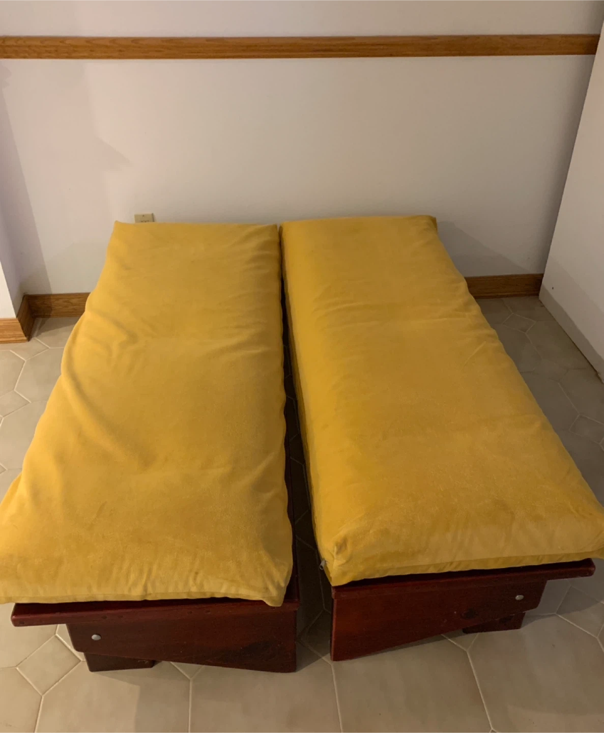 2 yellow fabric futon in good condition. The mattress can be used aline in the floor, soft and comfortable.