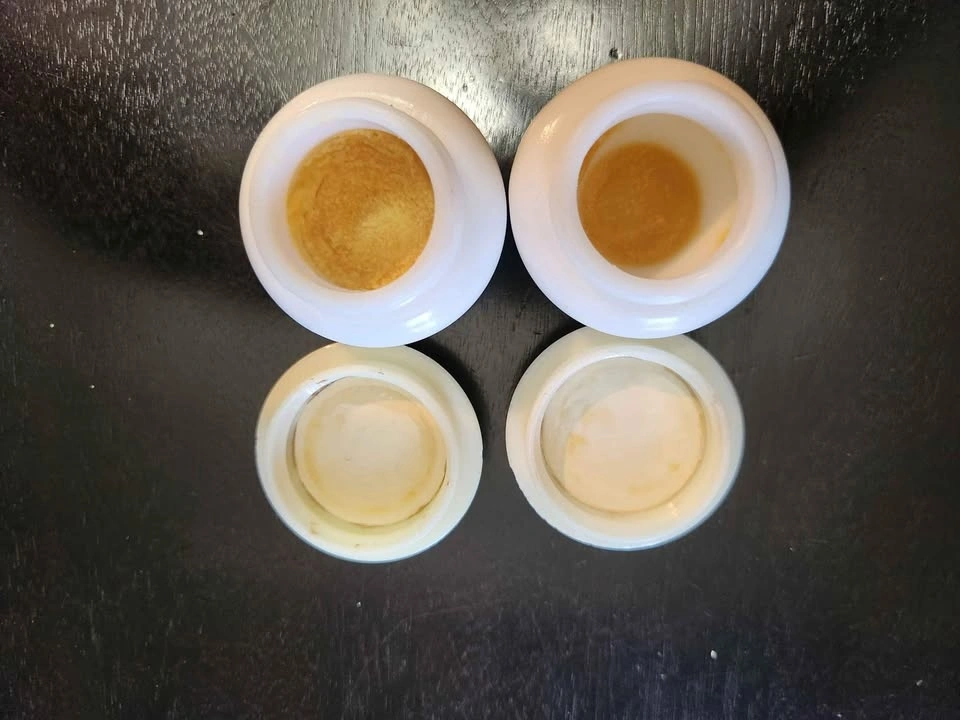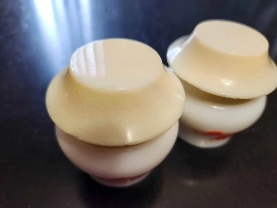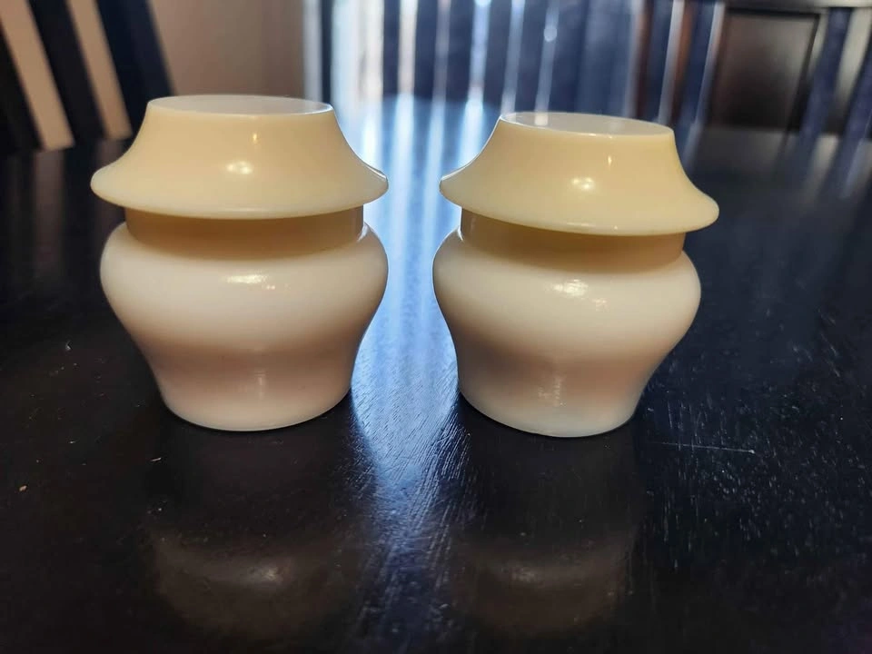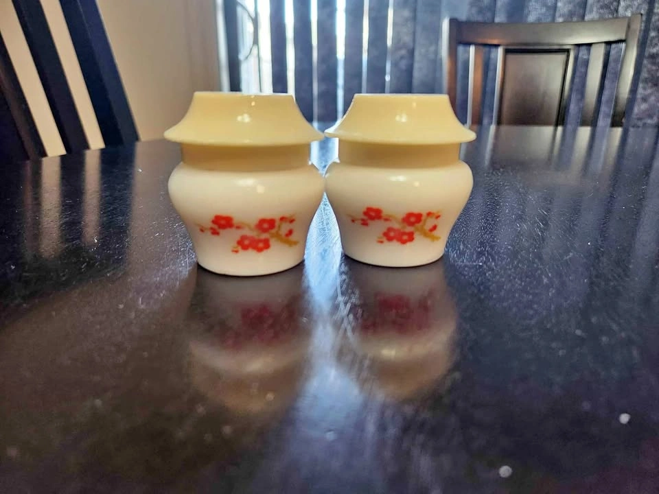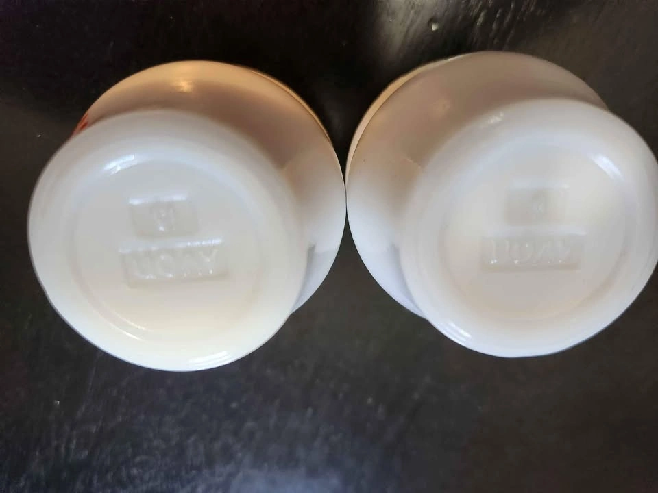 2 milk glass vanity jars with plastic lids and orange flowers. 2.25" tall. Cream sachet- 1 has a trace amount left, 1 is about 1/3 full. Fragrances unknown. These are collectable and vintage 1970s. Avon. Located in Sherwood Park. See my items items for more vintage fragrances/ bottles