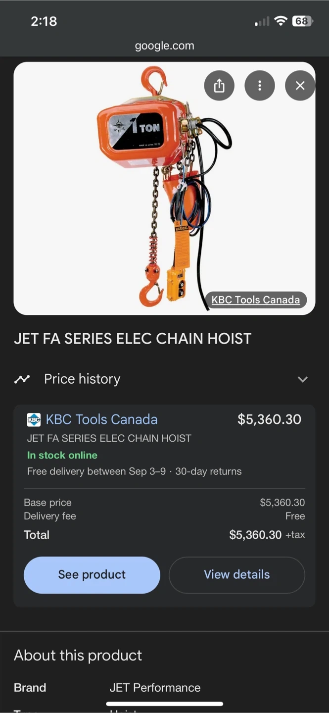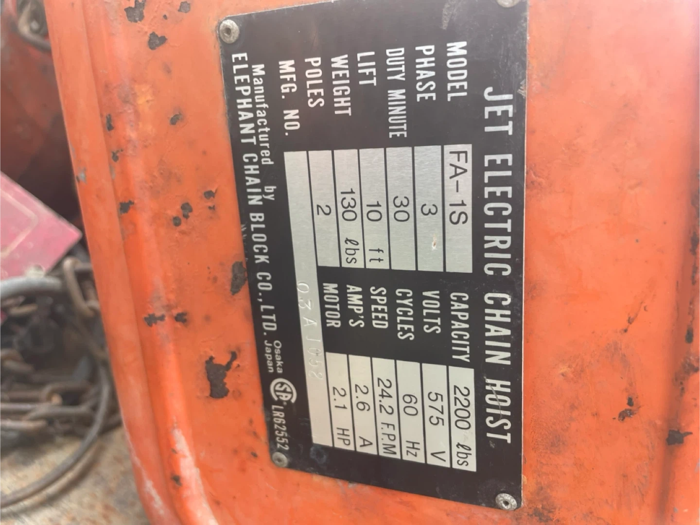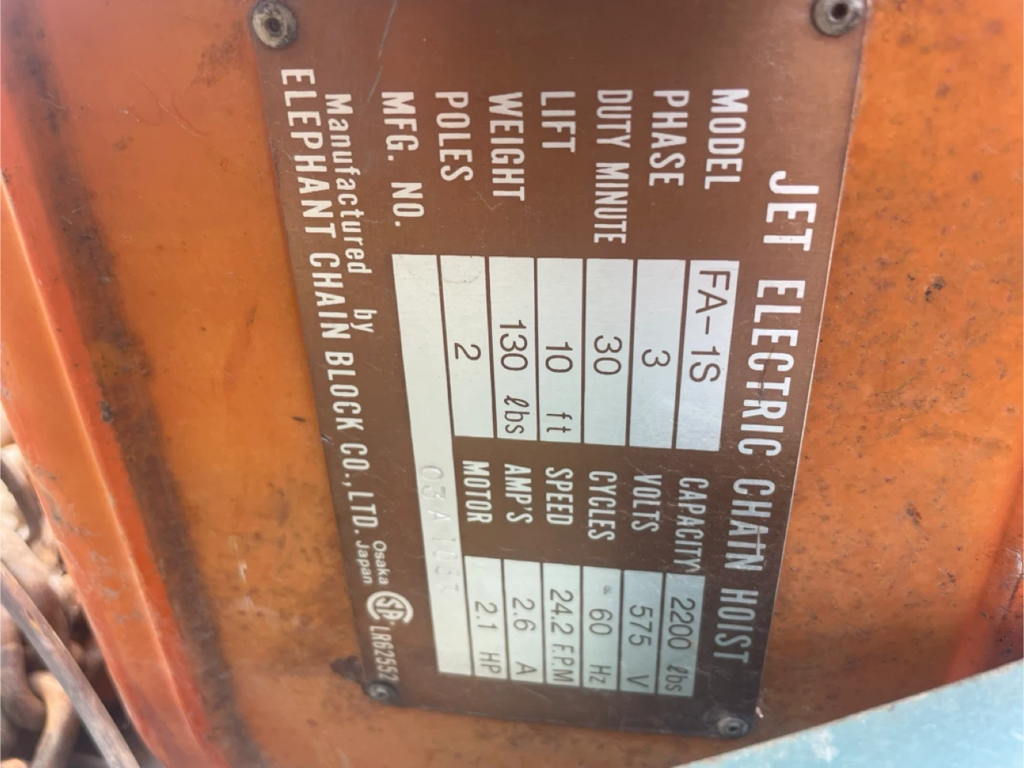 Selling a JET FA-1S electric chain hoist with a 2200 lbs capacity. It has a lift of 10 ft and operates at 60 Hz. The hoist requires 575V and 2.6 Amps. It's manufactured by Elephant Chain Block Co., LTD. Can deliver as well call or text 587 three five seven 9381 these are over 5k to buy new and I’m seeking mine for a STEAL at $500 each
