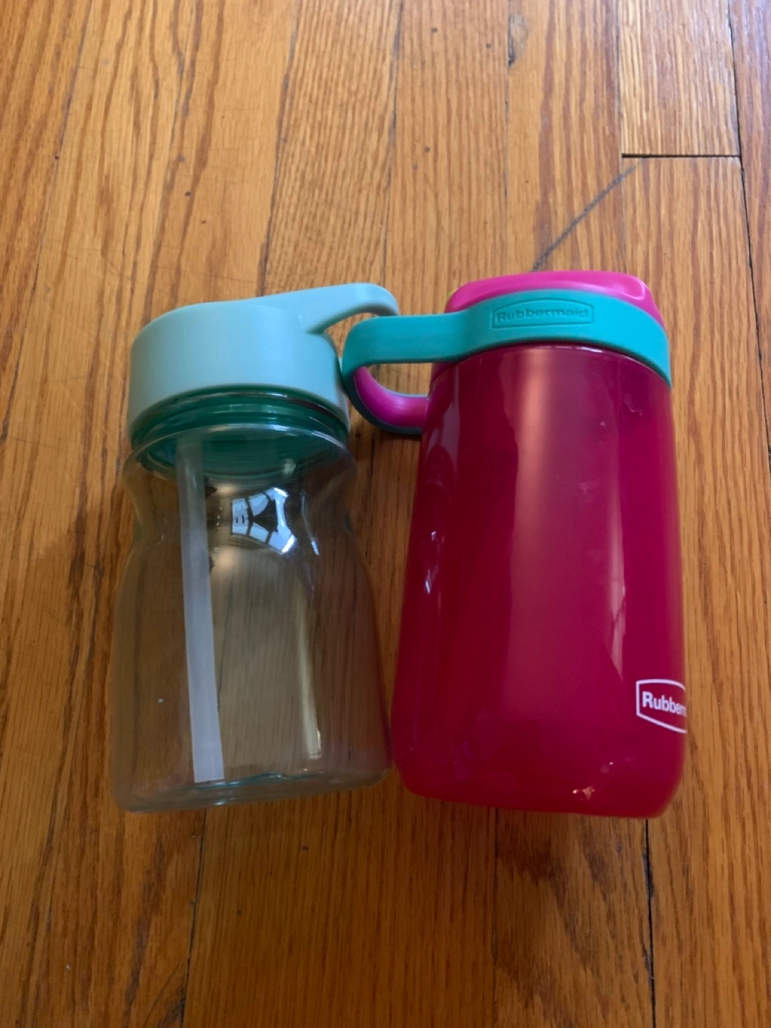 Two kids' water bottles. One clear with a straw and teal accents. One pink Rubbermaid with a flip-top lid. Both have carrying handles.