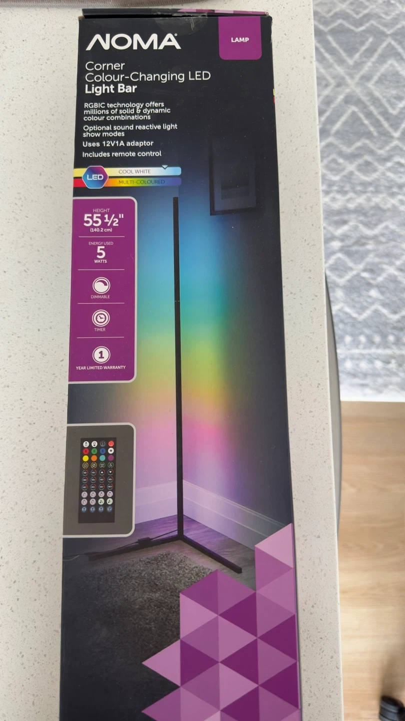 Selling a NOMA Corner Colour-Changing LED Light Bar. It uses RGBIC technology and offers millions of solid and dynamic colour combinations. It also has optional sound reactive light show modes. It uses a 12V1A adaptor and includes a remote control. The height is 55 1/2" (140.2 cm) and it uses 5 watts. It's dimmable and has a timer. The box is included