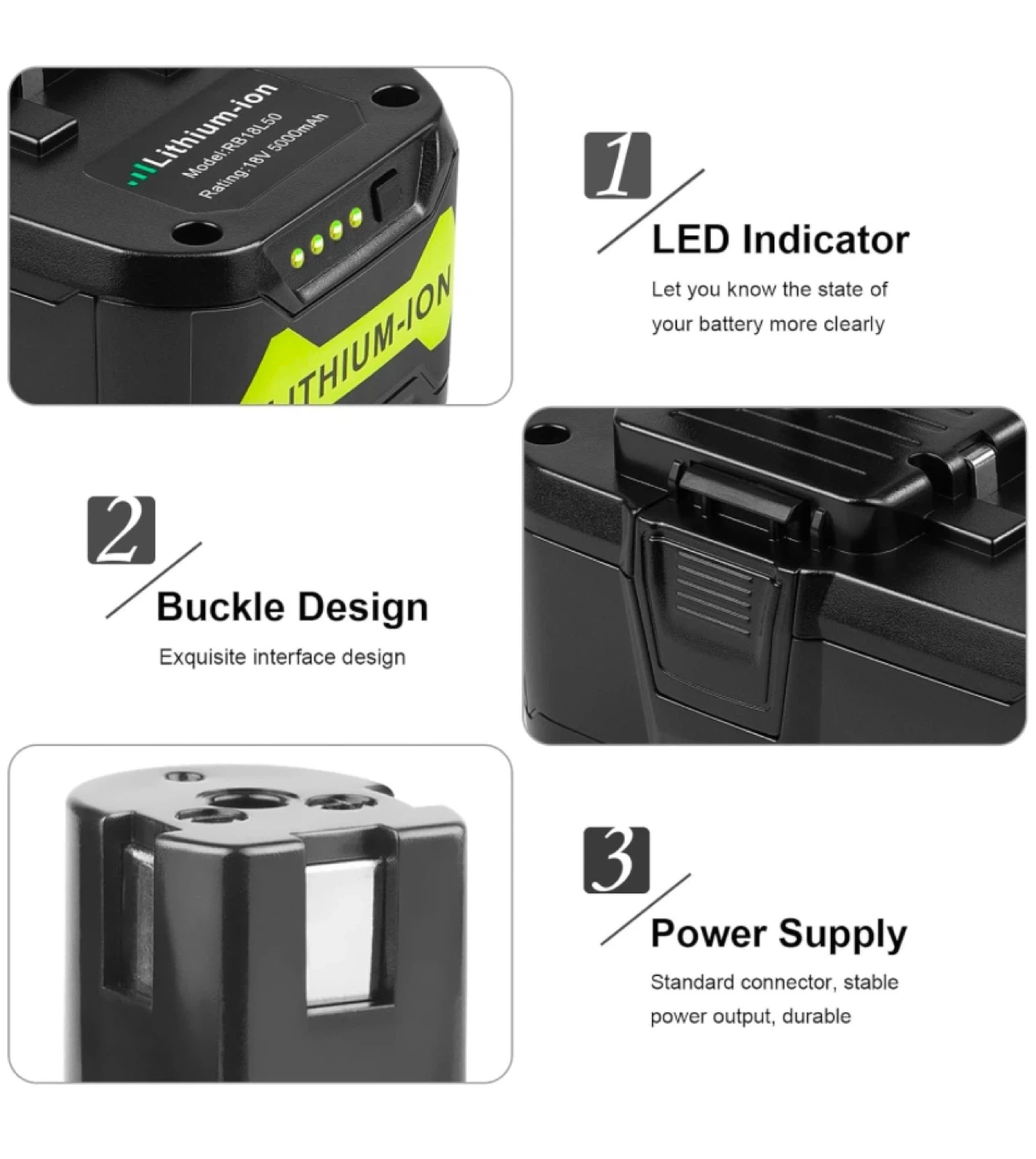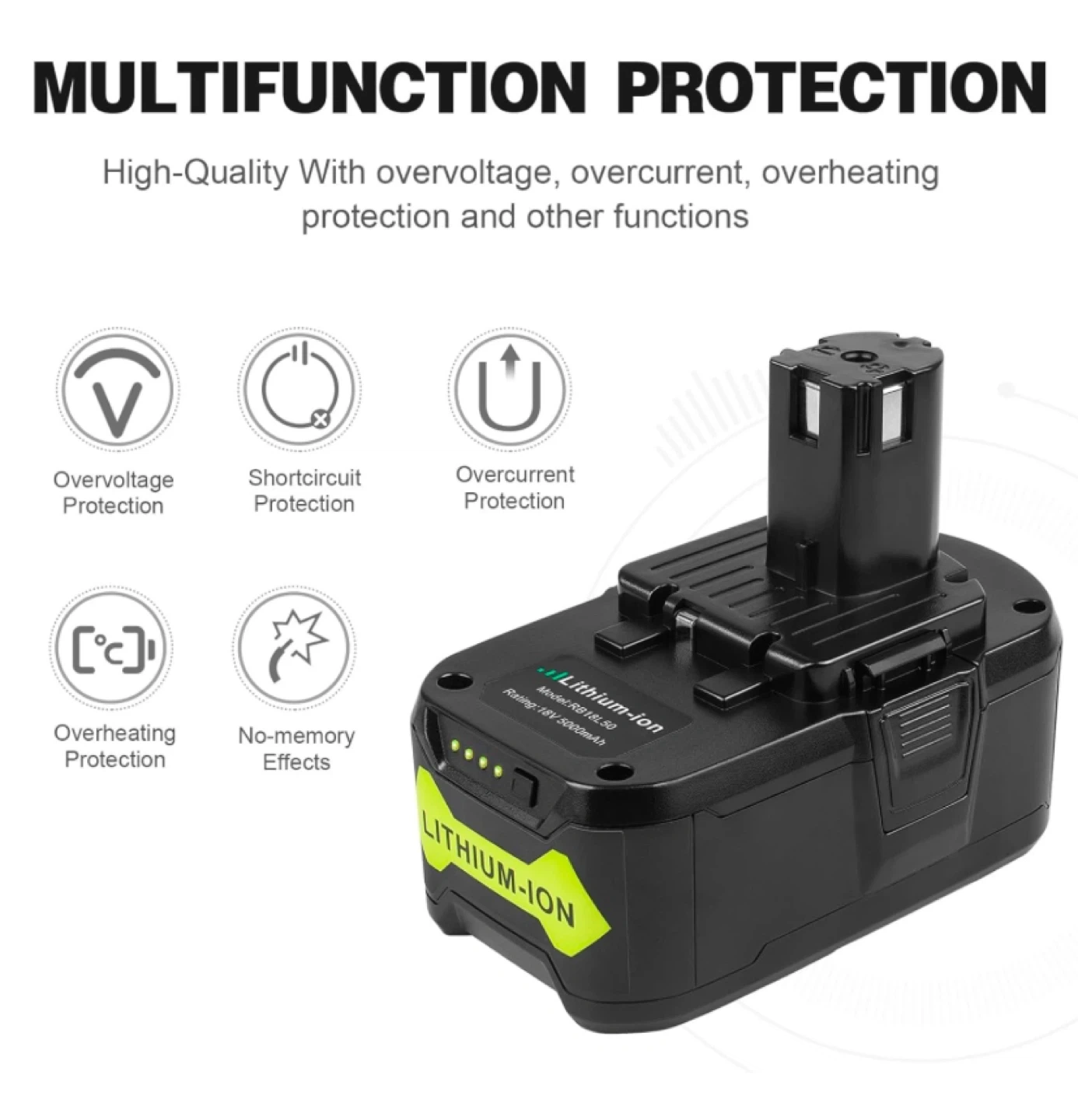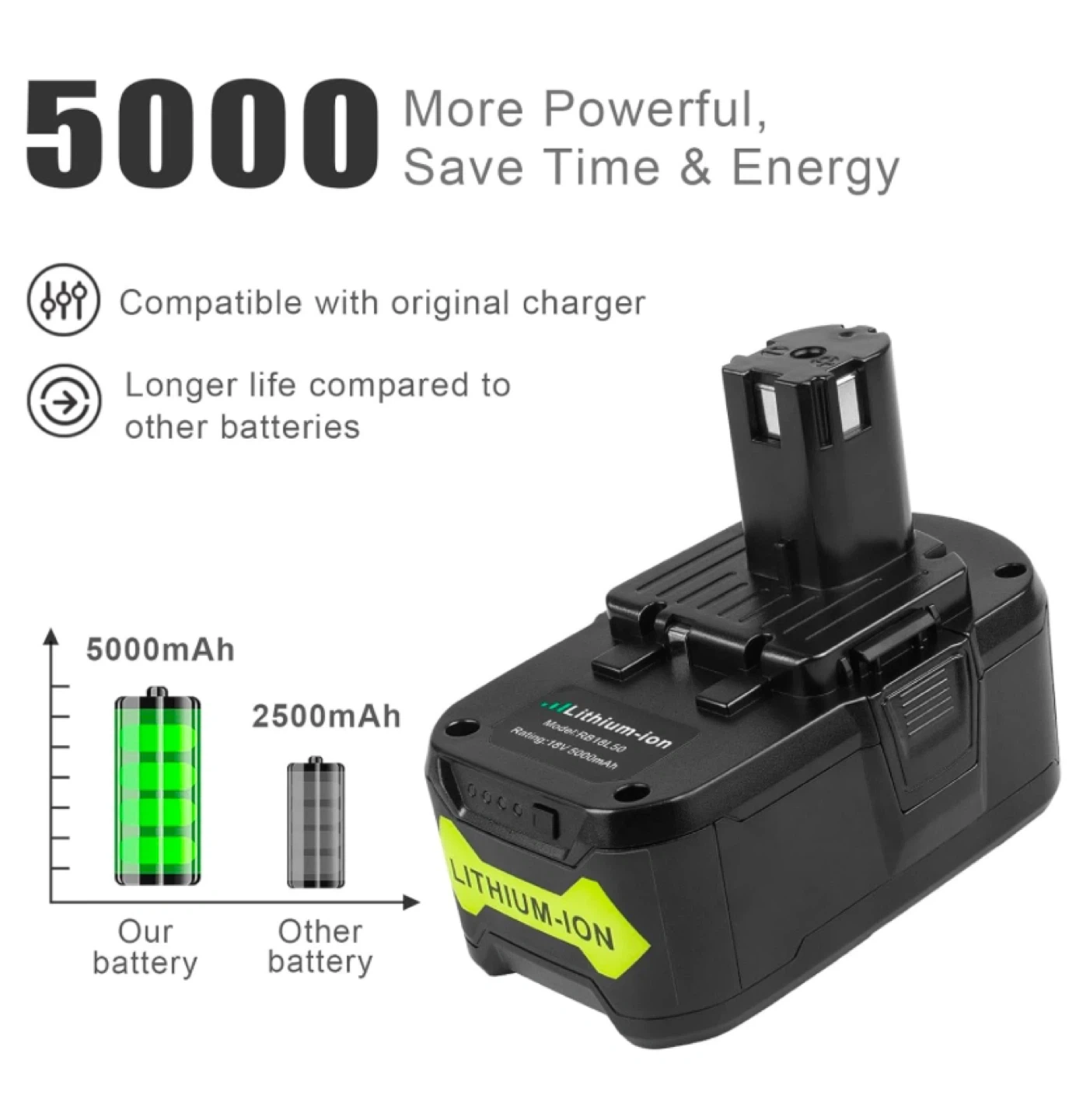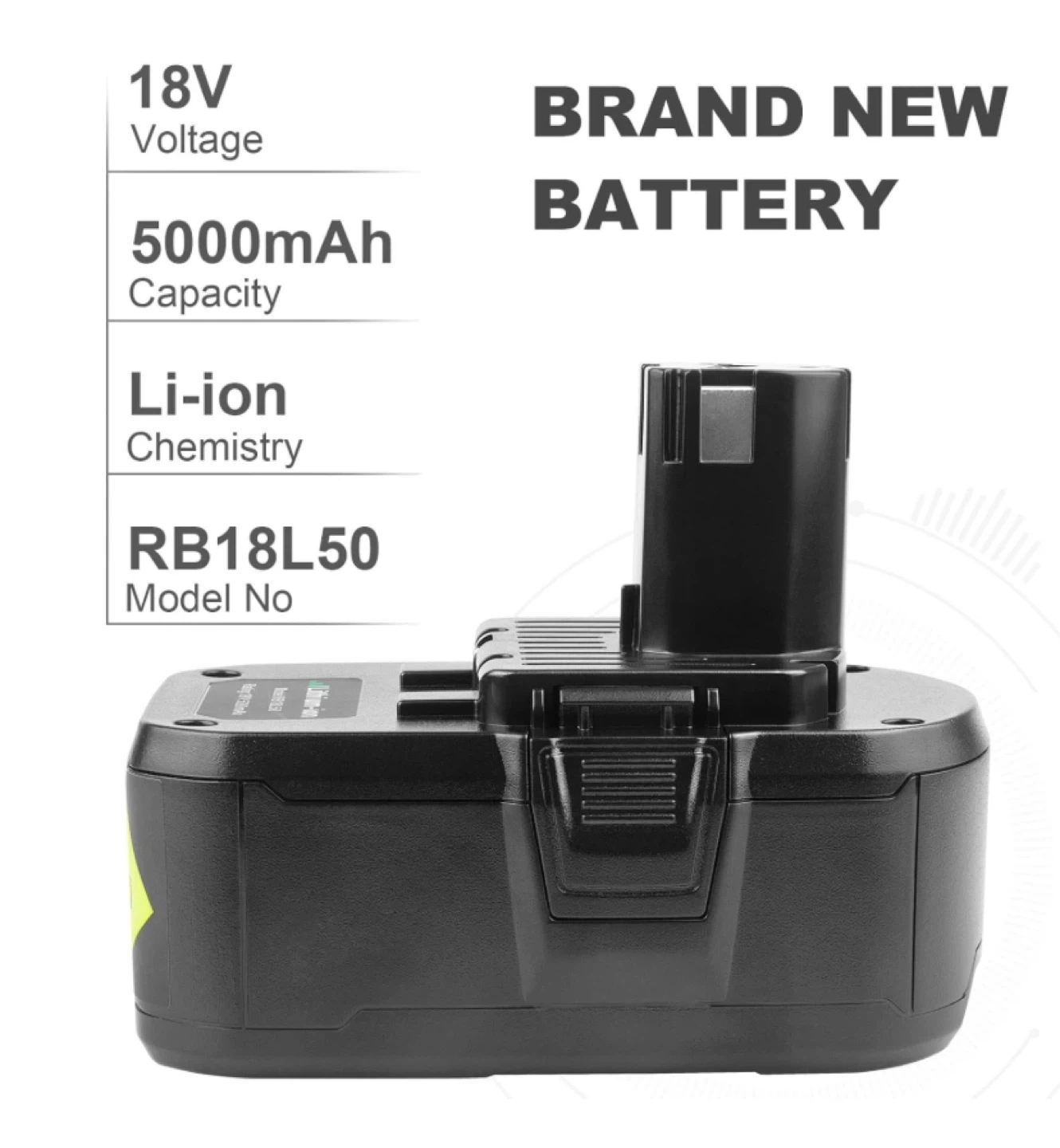 Enhance your Ryobi power tools with this set of two new, high-capacity 18V 5000mAh lithium-ion replacement batteries, model RB18L50. These batteries are designed to be perfectly compatible with Ryobi 18V tools, offering longer life and reliable performance compared to standard batteries. Compatible with original chargers and equipped with multifunction protection against overvoltage, overcurrent, and overheating, they ensure safe and efficient operation. Specifications: * Voltage: 18V * Capacity: 5000mAh * Battery Type: Lithium-Ion * Model: RB18L50 * Protection: Overvoltage, Overcurrent, Overheating, Shortcircuit As a friendly heads-up, if this ad is still up, the batteries are still up for grabs! Message me if interested.