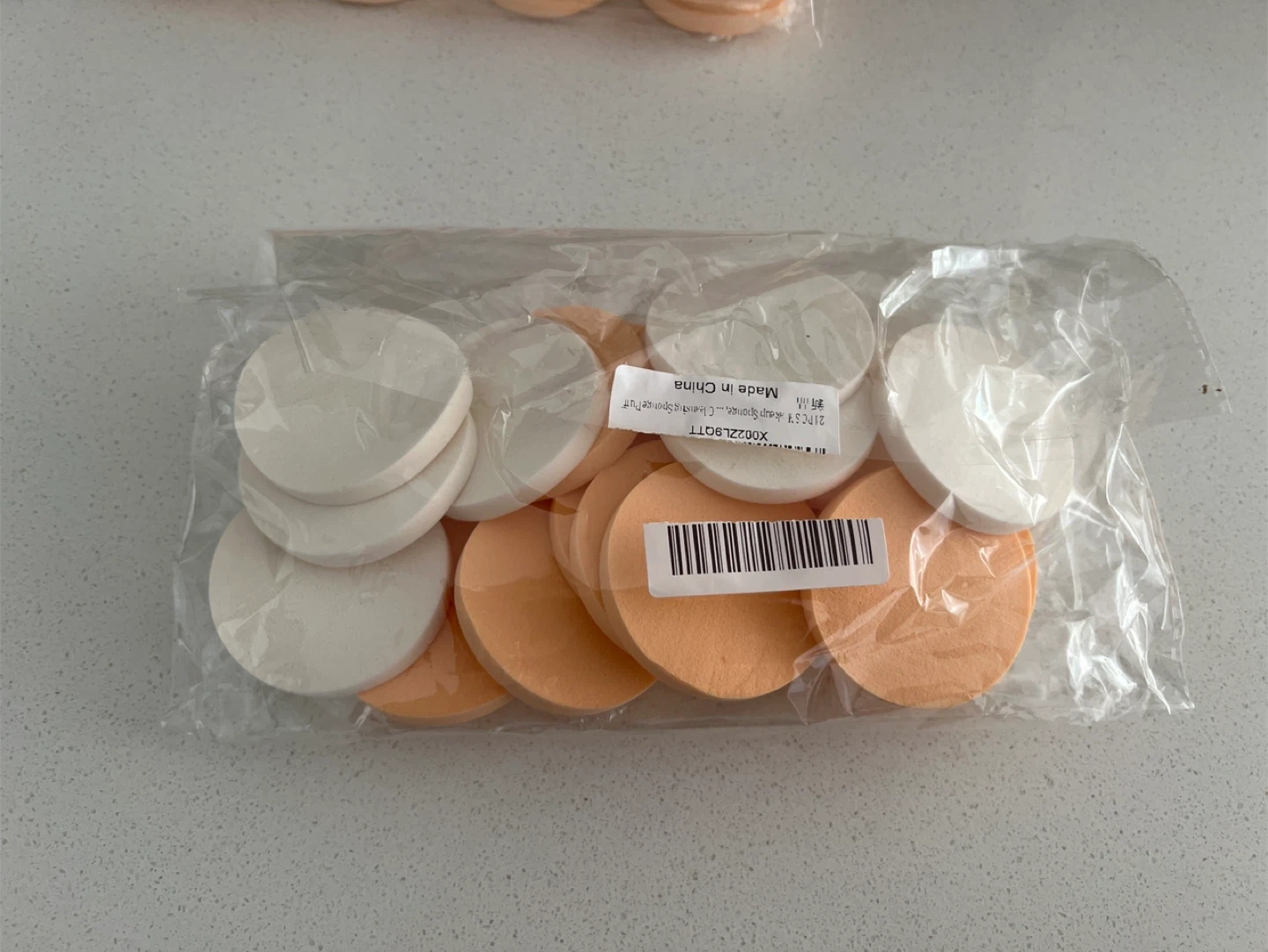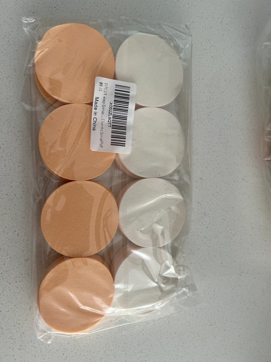 Selling a new pack of 24 makeup sponges. One side is peach and the other is white. They are clean and ready to use! I am also giving with this the opened package which still have 19 unused sponges.