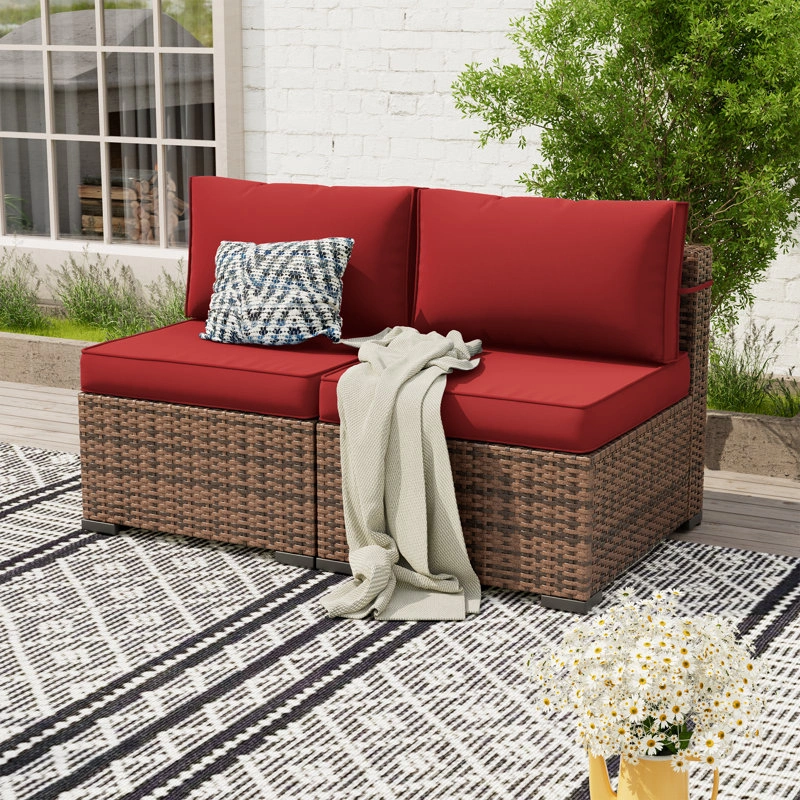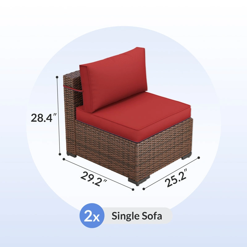 This is a lovely 2-piece outdoor sectional sofa set, perfect for your patio or deck! The cushions are a vibrant red and are made of breathable fabric. The set features: - Water-resistant cushions - Non-slip pads - Removable covers - Upgraded hand-woven PE rattan - Adjustable raised feet - 4" seat cushions - 17.5" sitting height