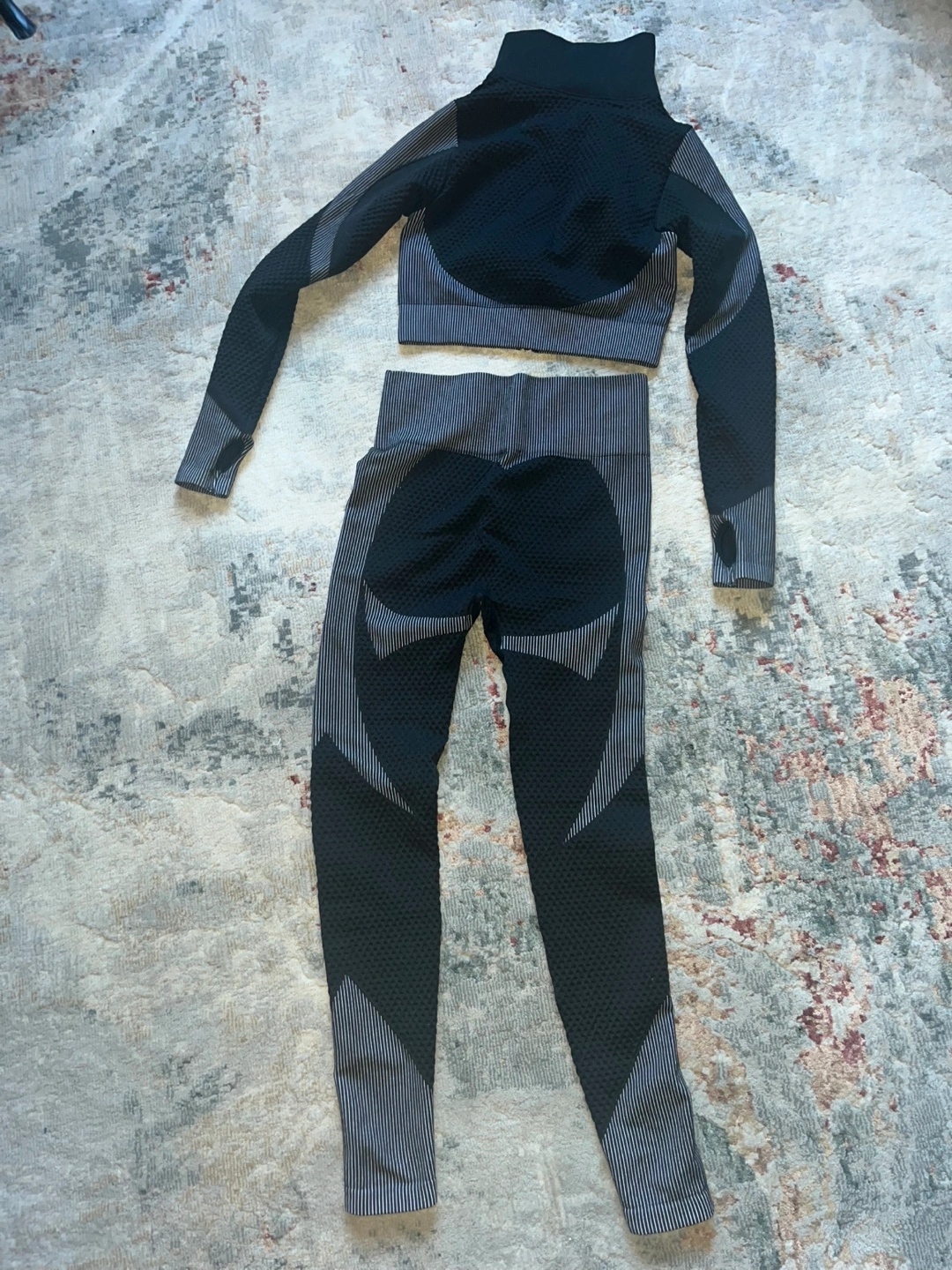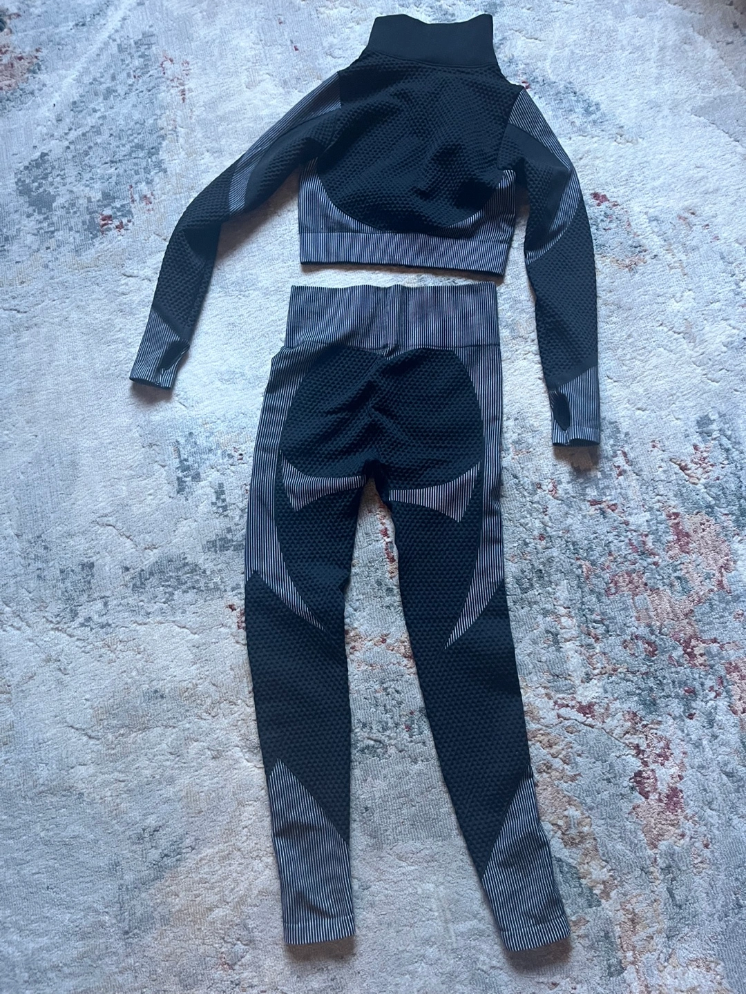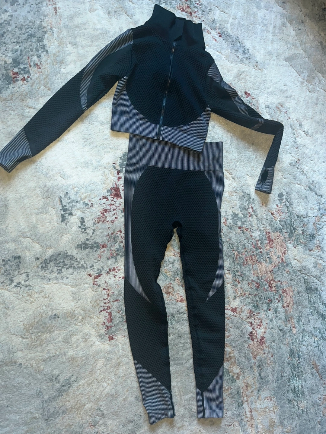 Workout set includes long-sleeve zip-up cropped top and high-waisted leggings. Features a textured, seamless design. Available in black and light grey. NOTE: grey set sold Brand new never worn $20 - ONE SET LEFT
