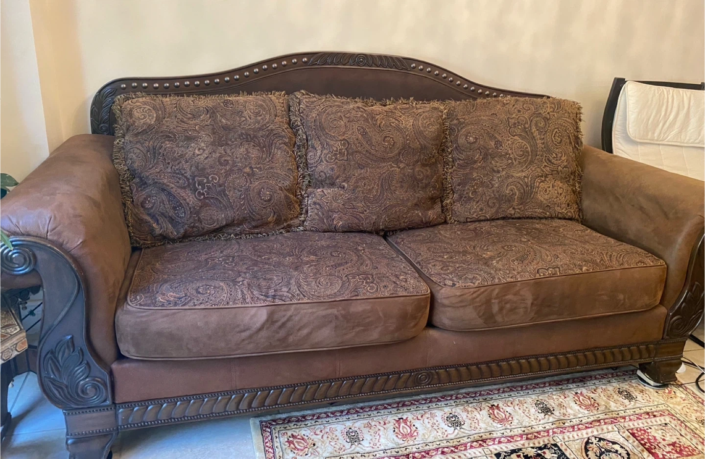 A 2 seater and a 3 seater cozy brown sofas with a detailed pattern! They come with matching cushions to complete the look. Perfect for adding a touch of elegance to your living space. They’re in good condition and ready for a new home!