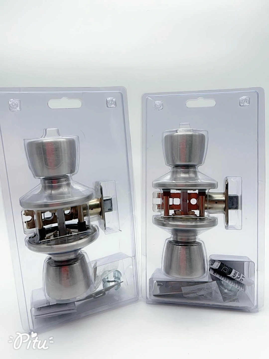 2 stainless steel door knob lock sets, each packaged in clear plastic with installation screws and instructions included. They have a modern, brushed metal finish and come with built-in locking mechanisms. Perfect for securing doors with a sleek look!