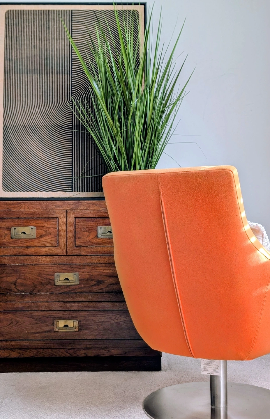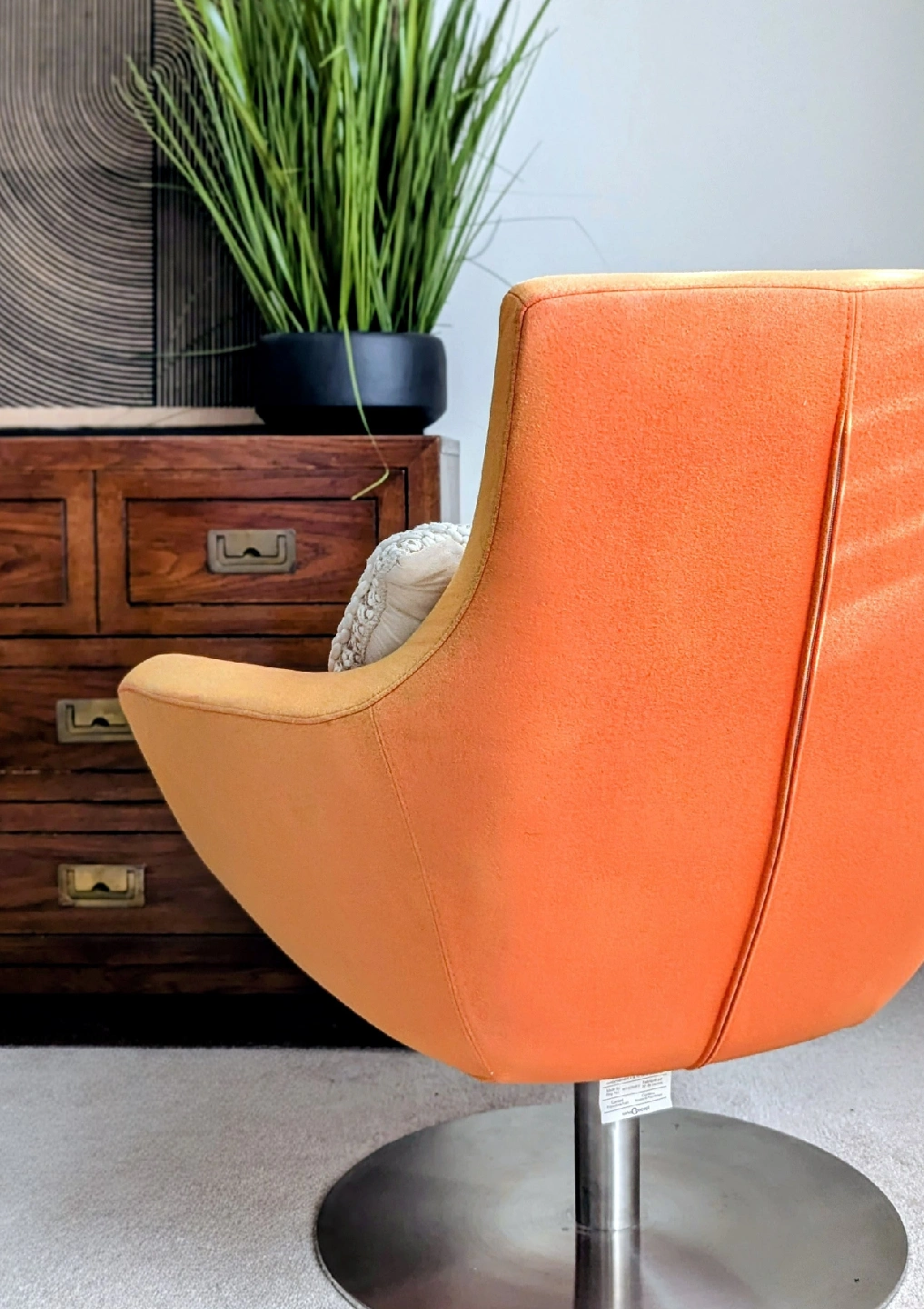 2 swivel Soho Concept chairs Excellent pieces of modern furniture design Contemporary occasional chairs with a stainless steel base. The padded seat cushion enhances the comfort of the chair. The seat has a steel structure with “S” shape springs for extra flexibility and strength. This steel frame molded by injecting polyurethane foam.The chair is suitable for both residential and commercial use. Absolutely gorgeous chairs that will make a big statement Material: orange wool Dimensions 31"H- 31" W - 28"D Base Swivel Stainless Steel - extremely stable and heavy Pick up in Whitby or delivery can be arranged